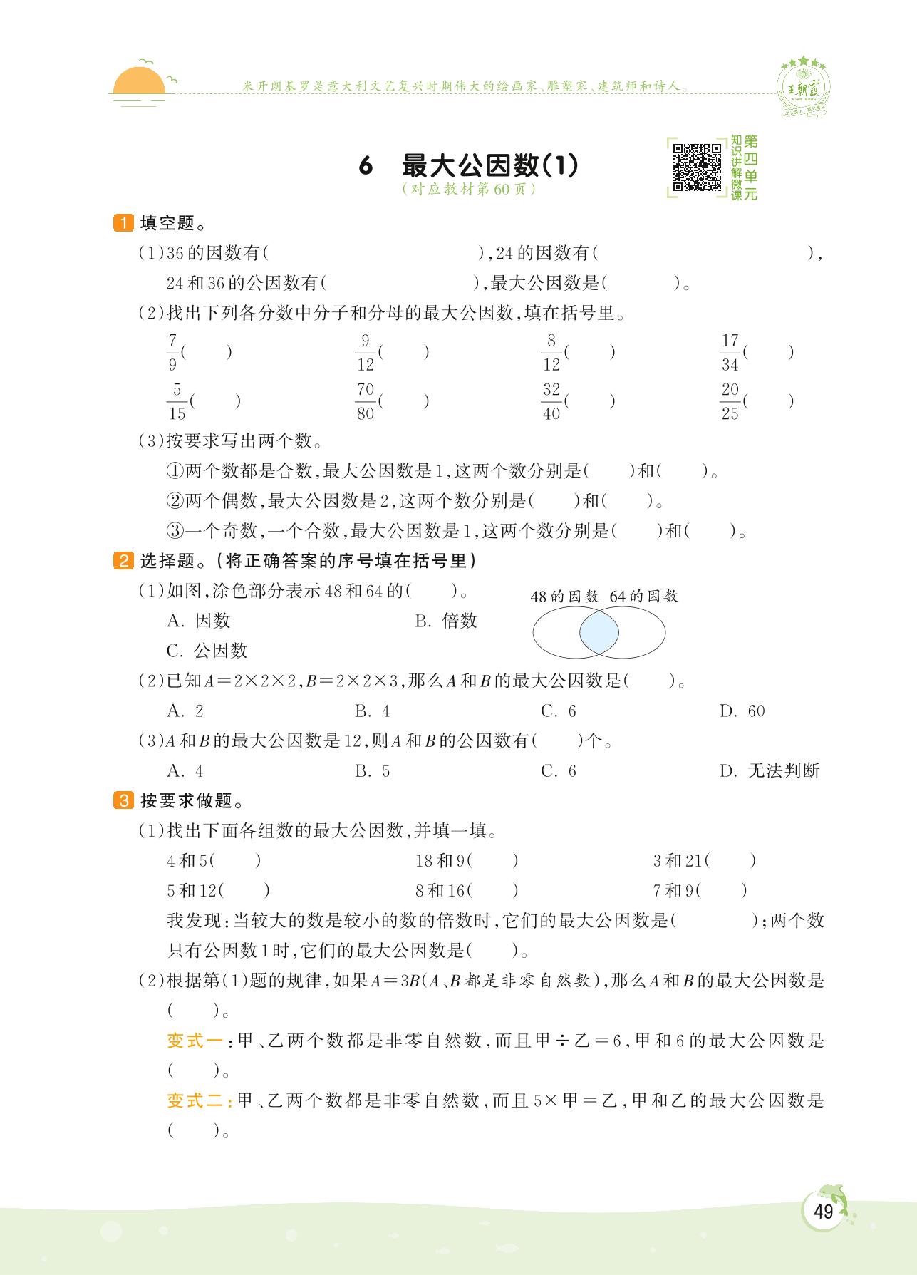 2022下册五年级数学人教版 第四单元——6 最大公因数(1)