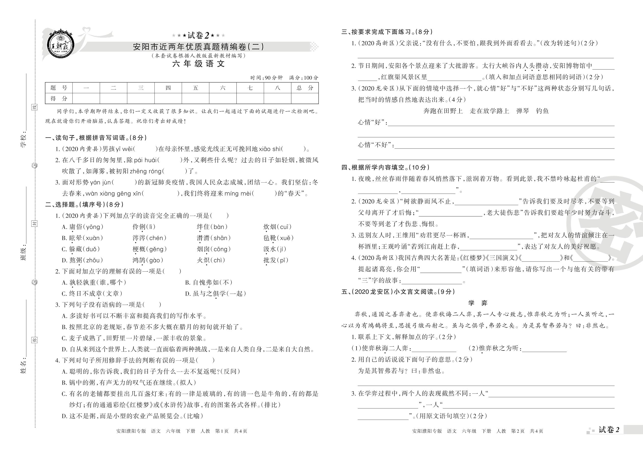 安阳市近两年优质真题精编卷(二)六年级下册语文(人教版)【2】