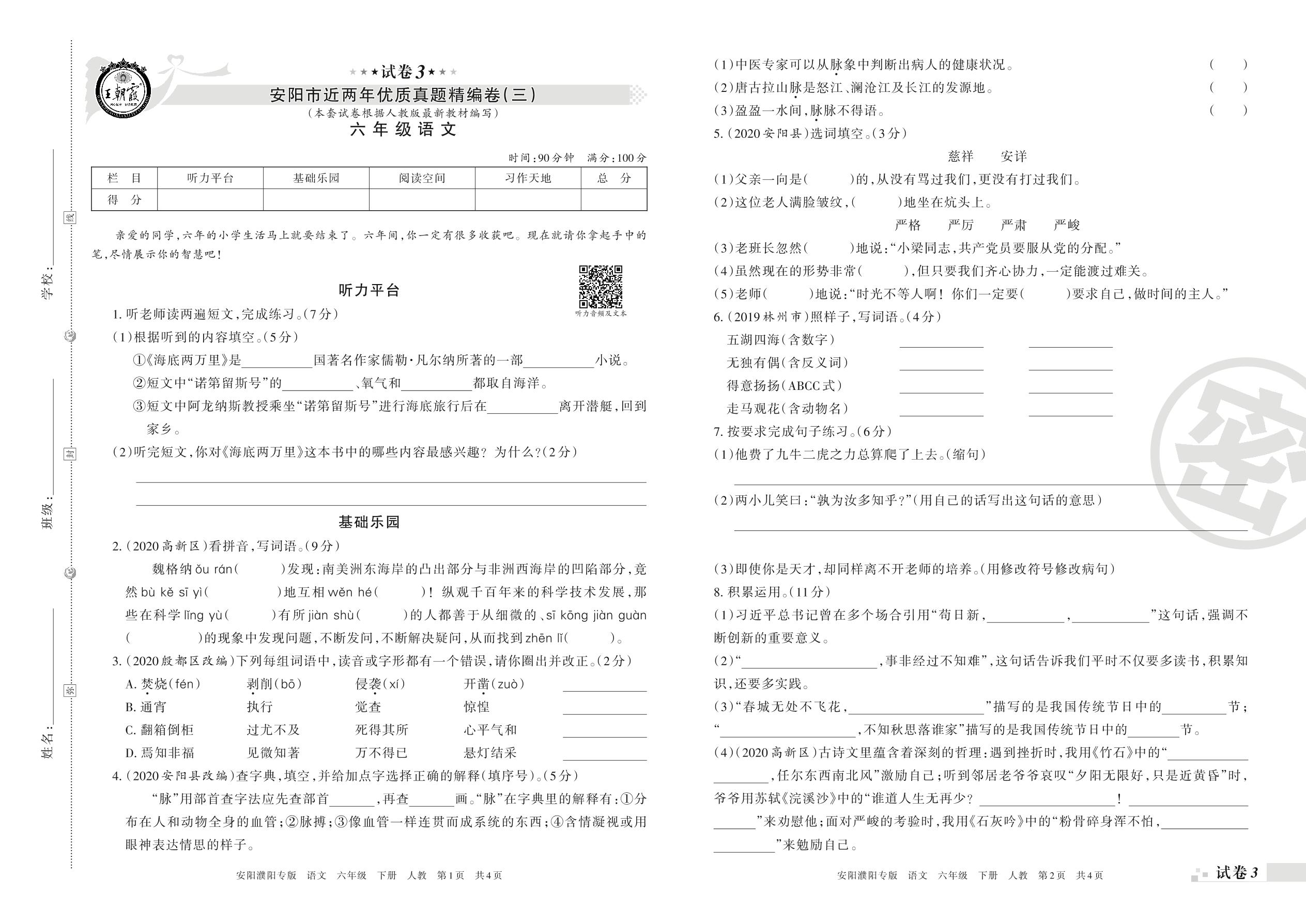安阳市近两年优质真题精编卷(三)六年级下册语文(人教版)【3】