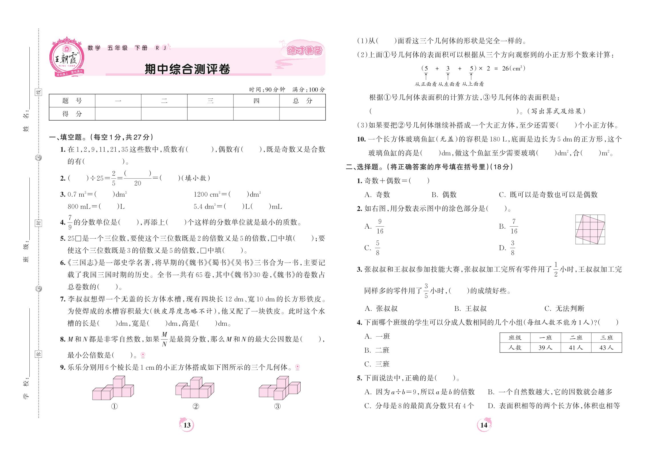 五年级数学人教版下册期中卷