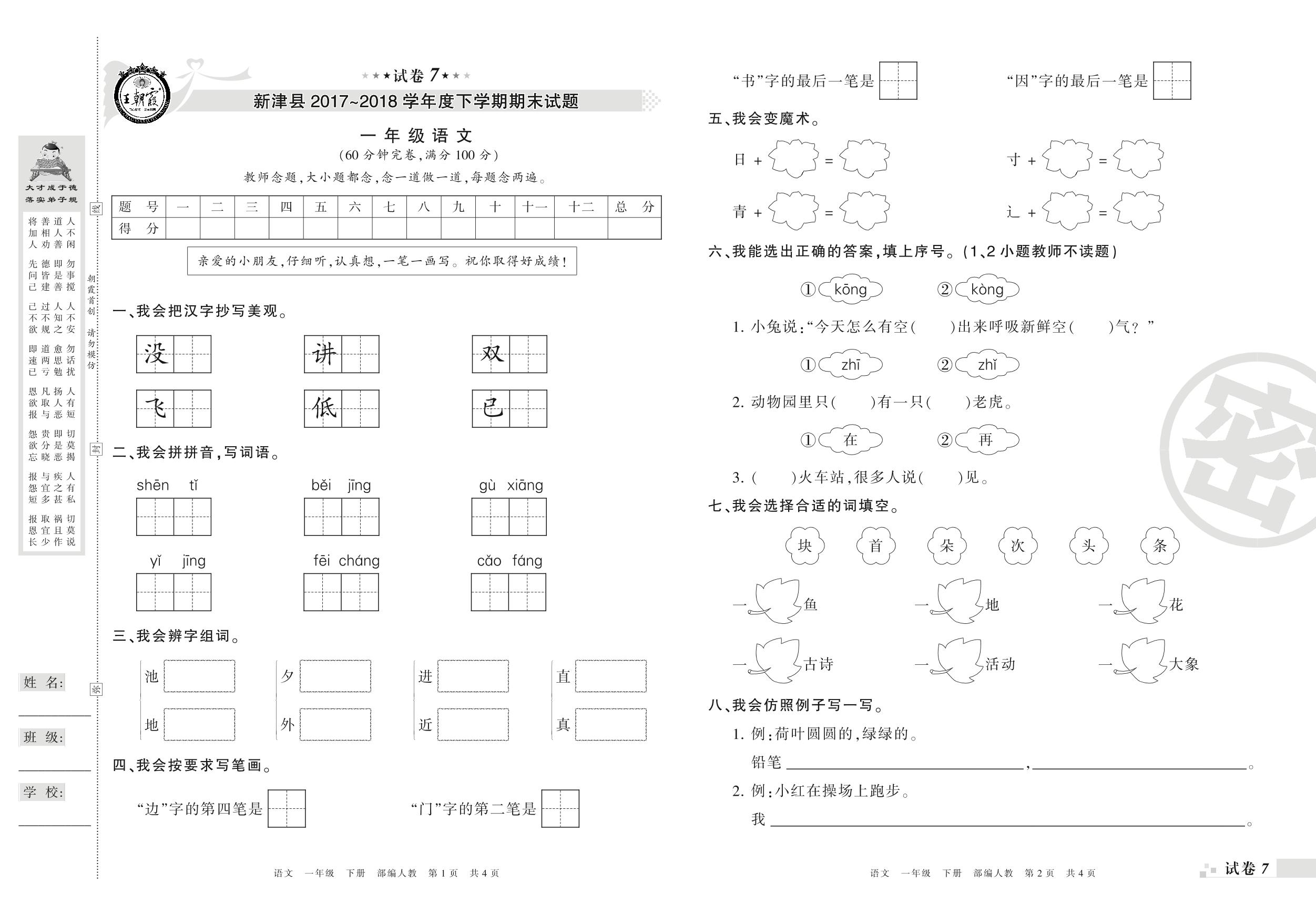一年级语文人教版下册期末卷