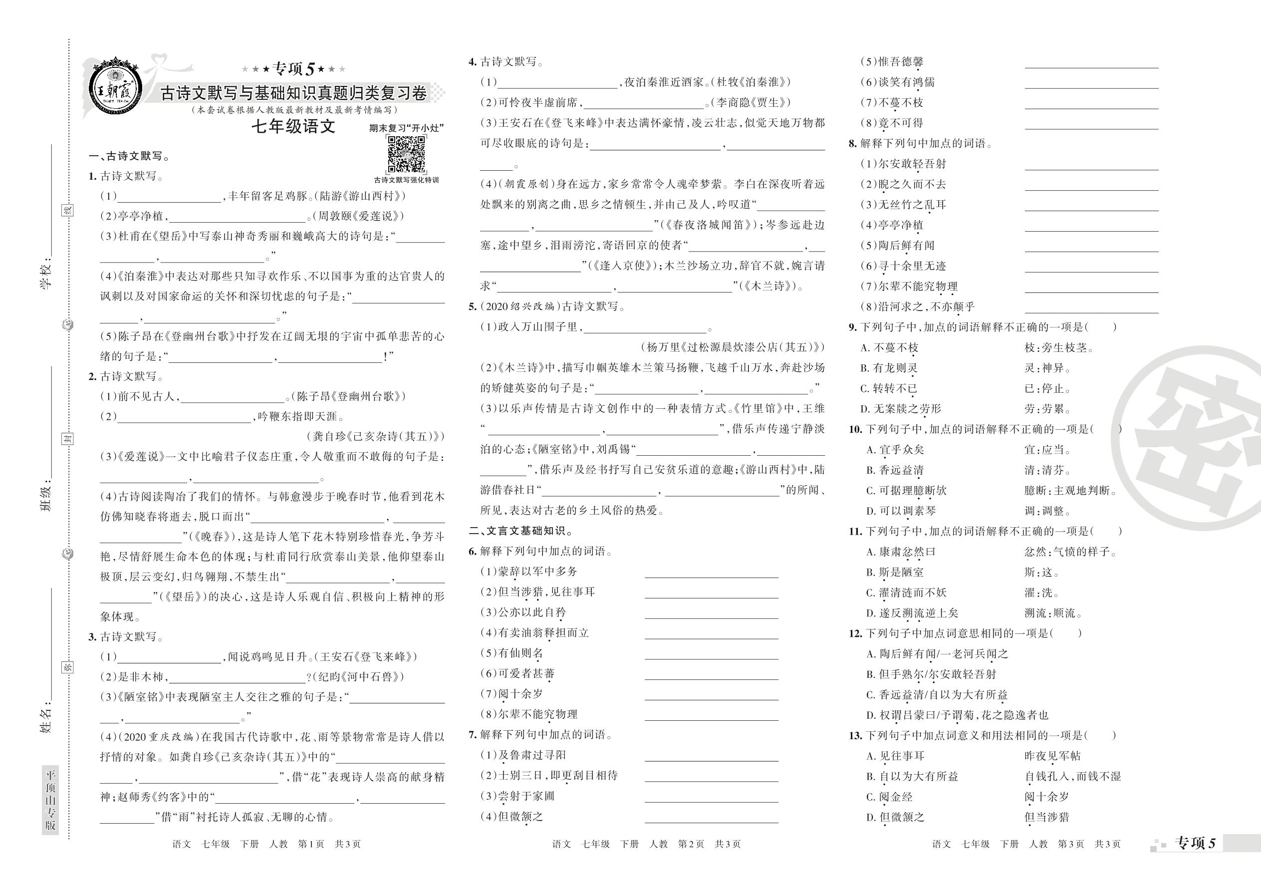 王朝霞期末专项卷——古诗文默写与基础知识、课内文言文阅读七年级下册语文(人教版)【0】