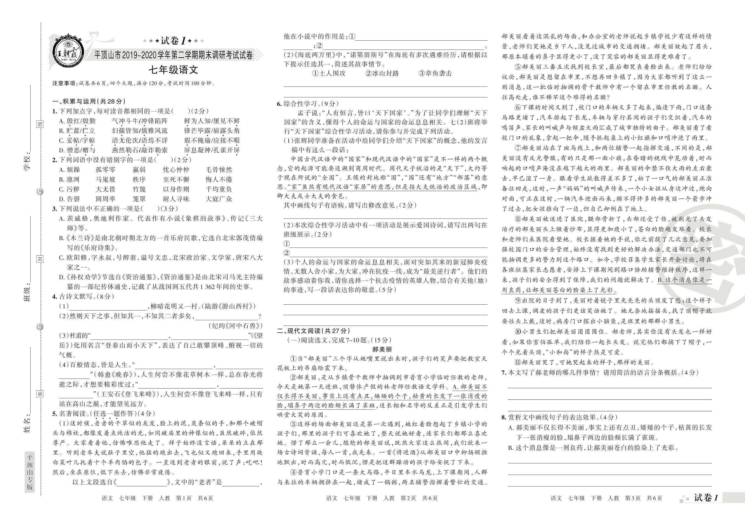 2019-2020学年第二学期平顶山市七年级语文试卷(人教版)【1】
