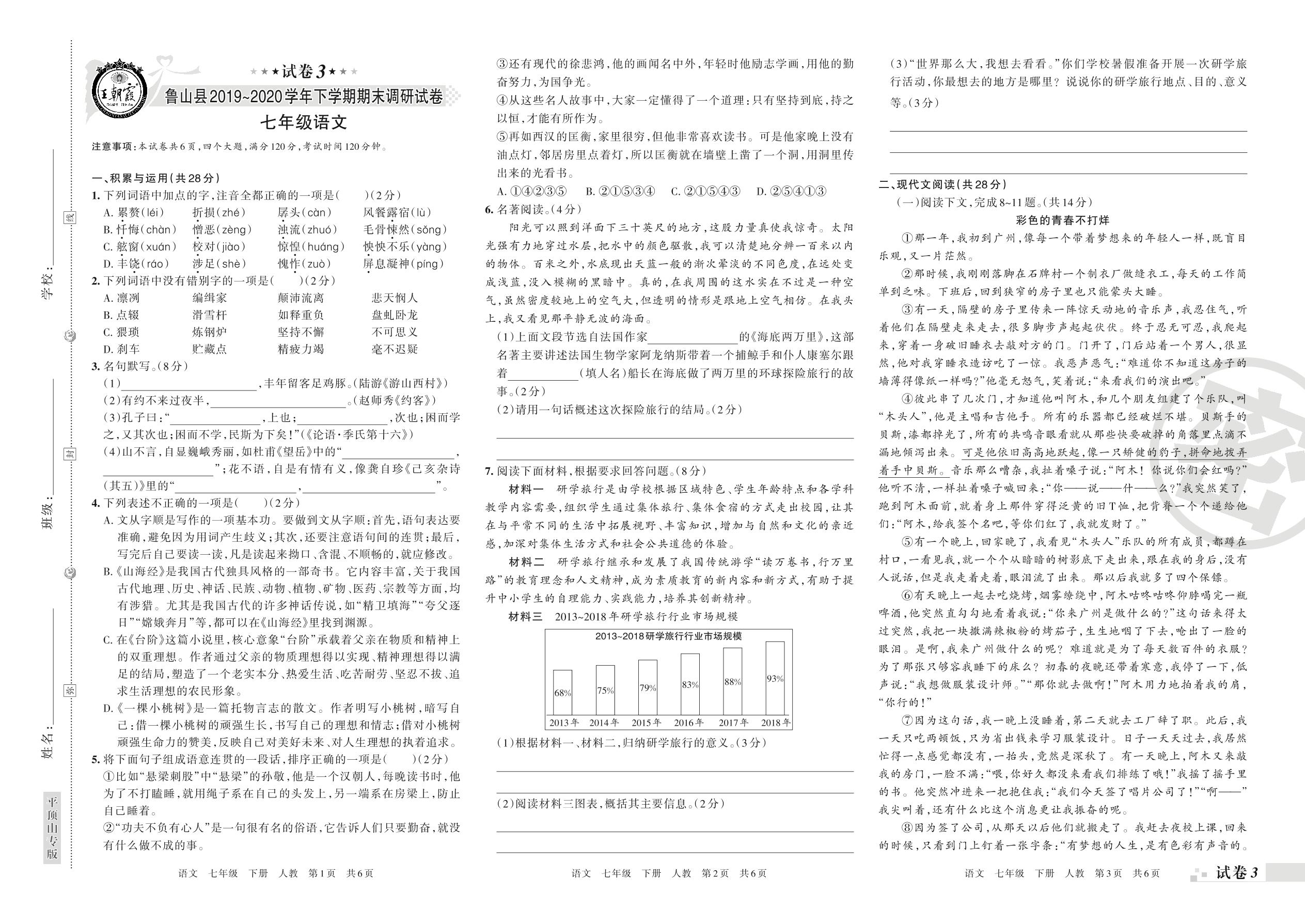 2019-2020学年第二学期平顶山市鲁山县七年级语文试卷(人教版)【3】