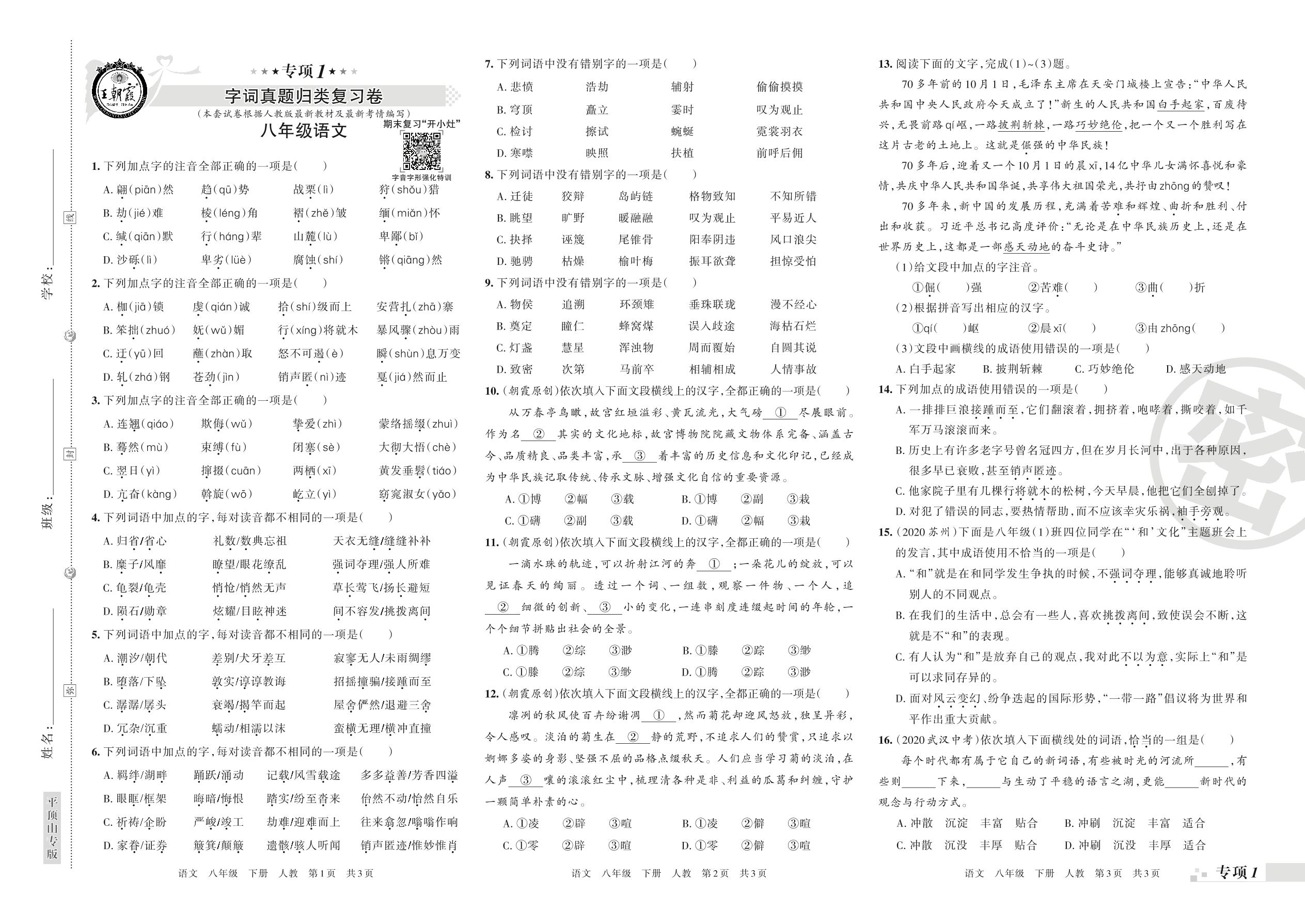 王朝霞期末专项卷——字词、句子真题归类复习八年级下册语文(人教版)_R210801234554【0】