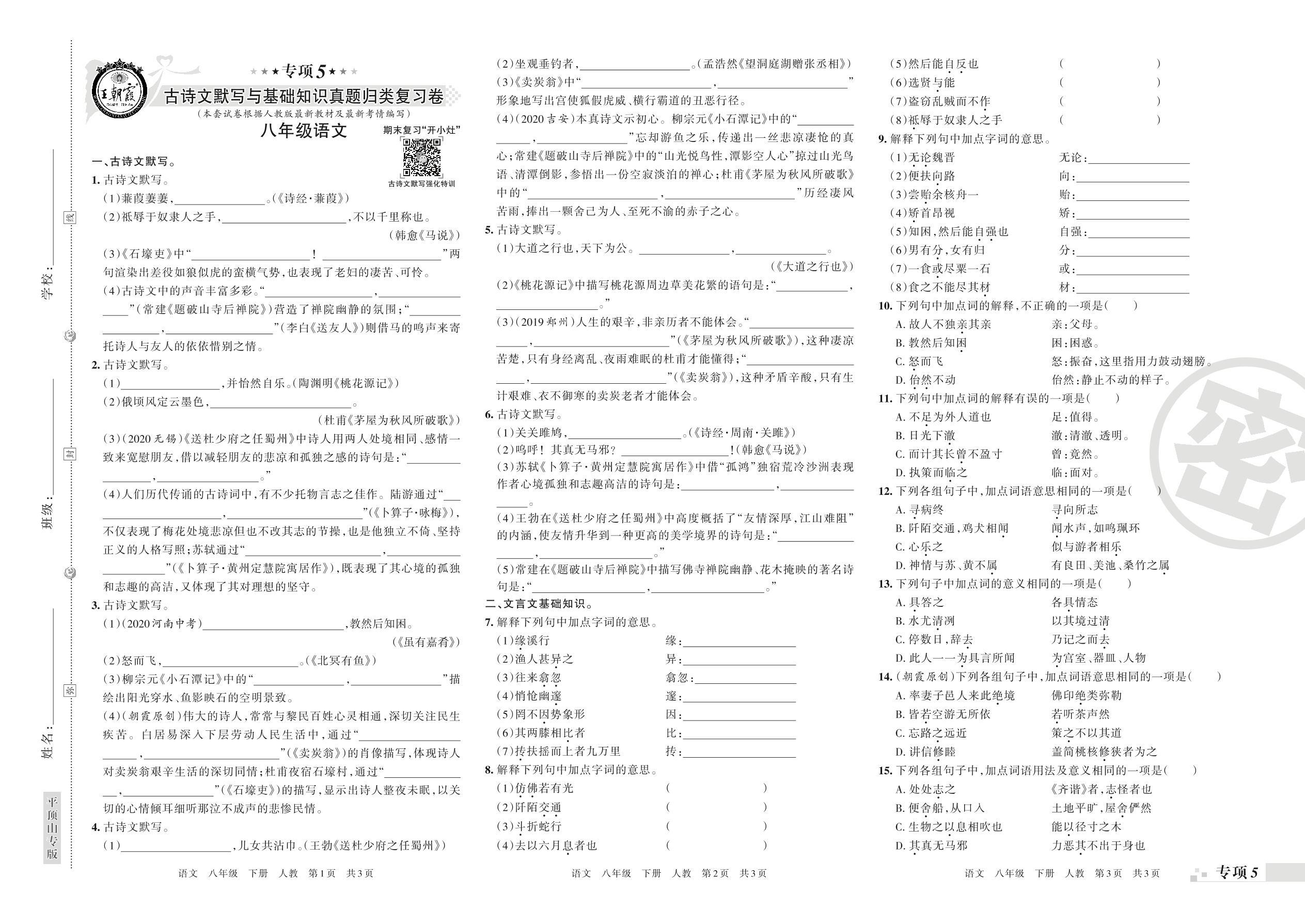 王朝霞期末专项卷——古诗文默写与基础知识、课内文言文阅读真题归类复习八年级下册语文(人教版)_R210801234619【0】
