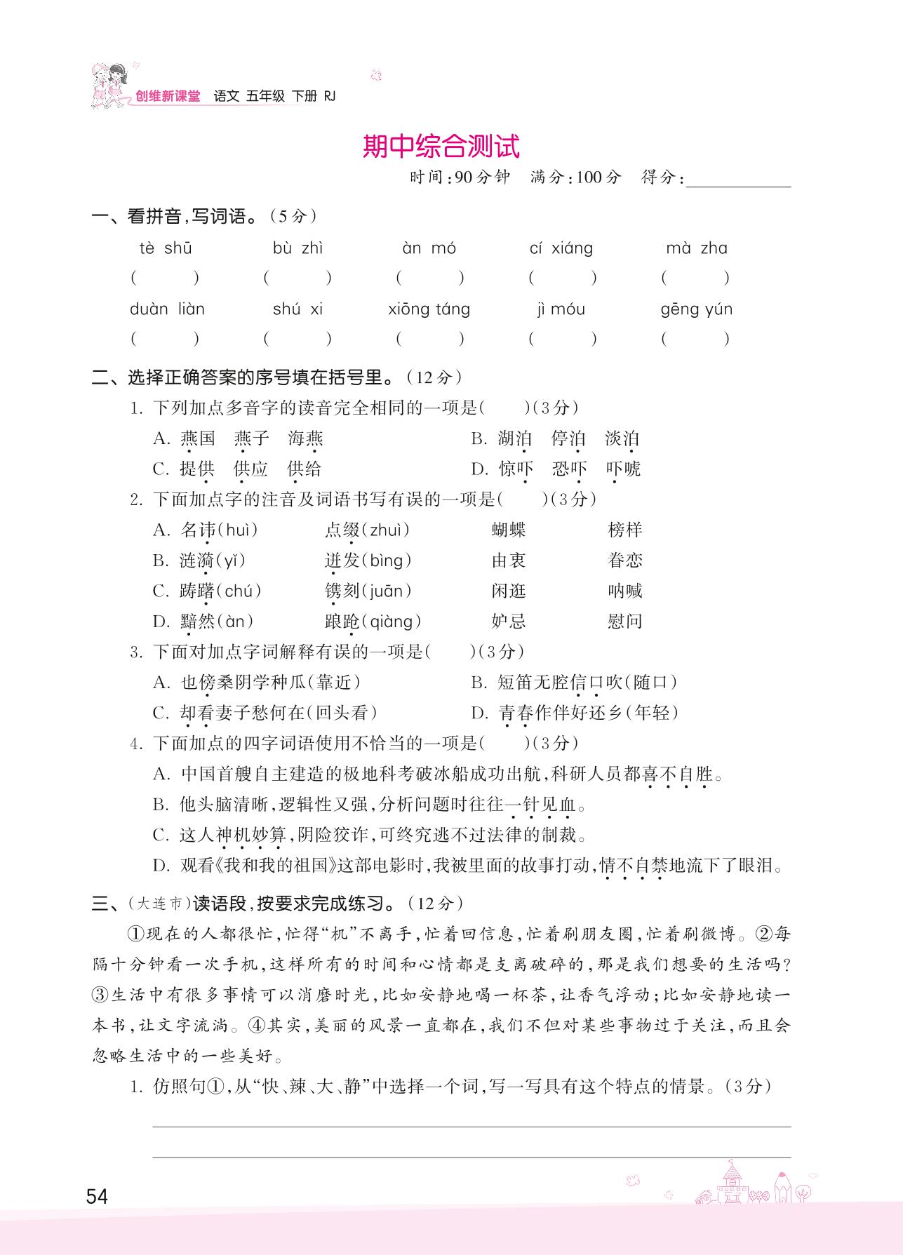 五年级语文人教版下册期中卷