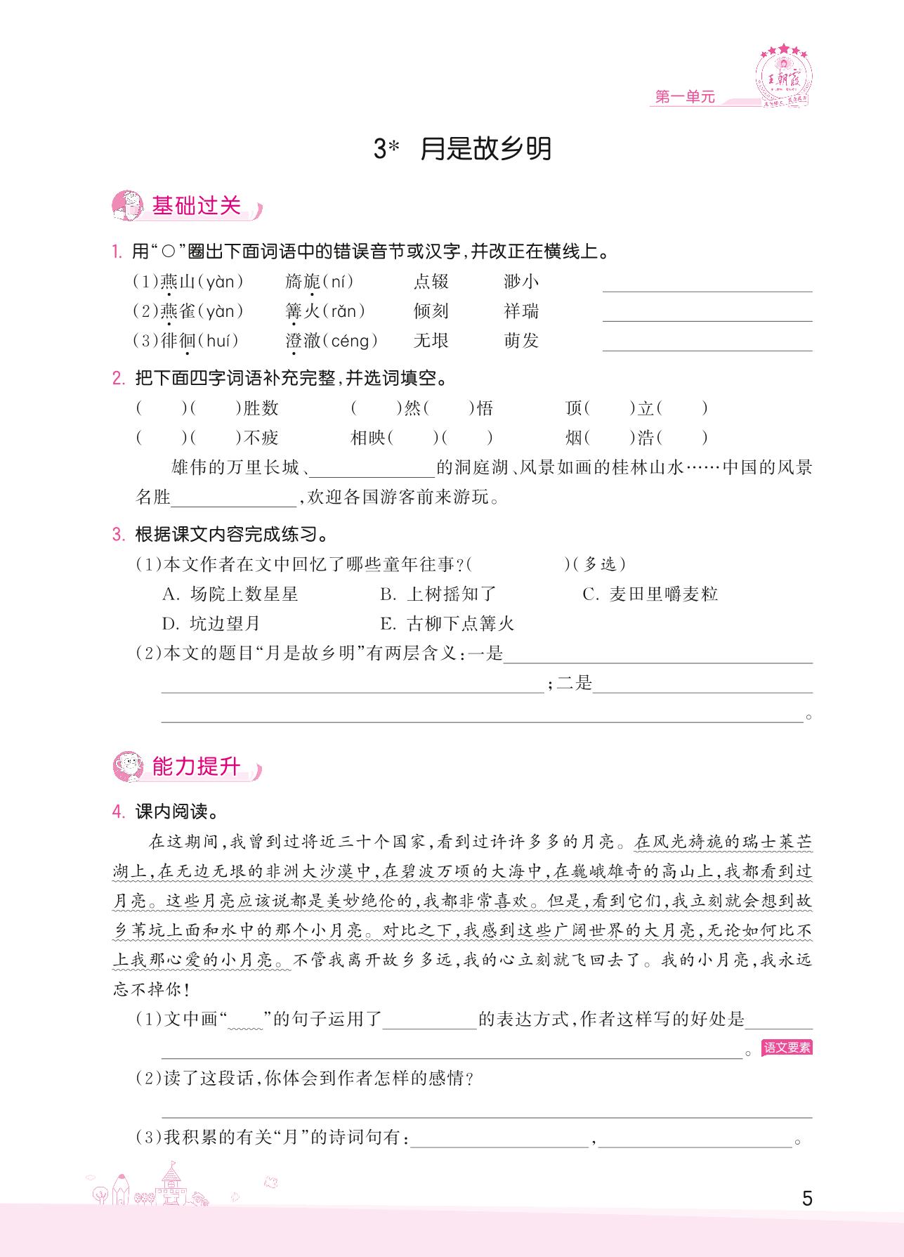2022下册五年级语文人教版 第一单元——3 月是故乡明
