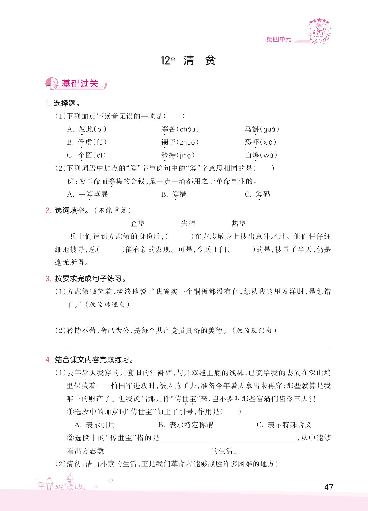 2022下册五年级语文人教版 第四单元——12 清贫