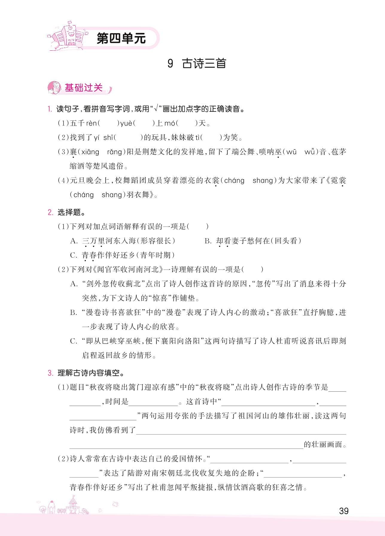 2022下册五年级语文人教版 第四单元——9 古诗三首