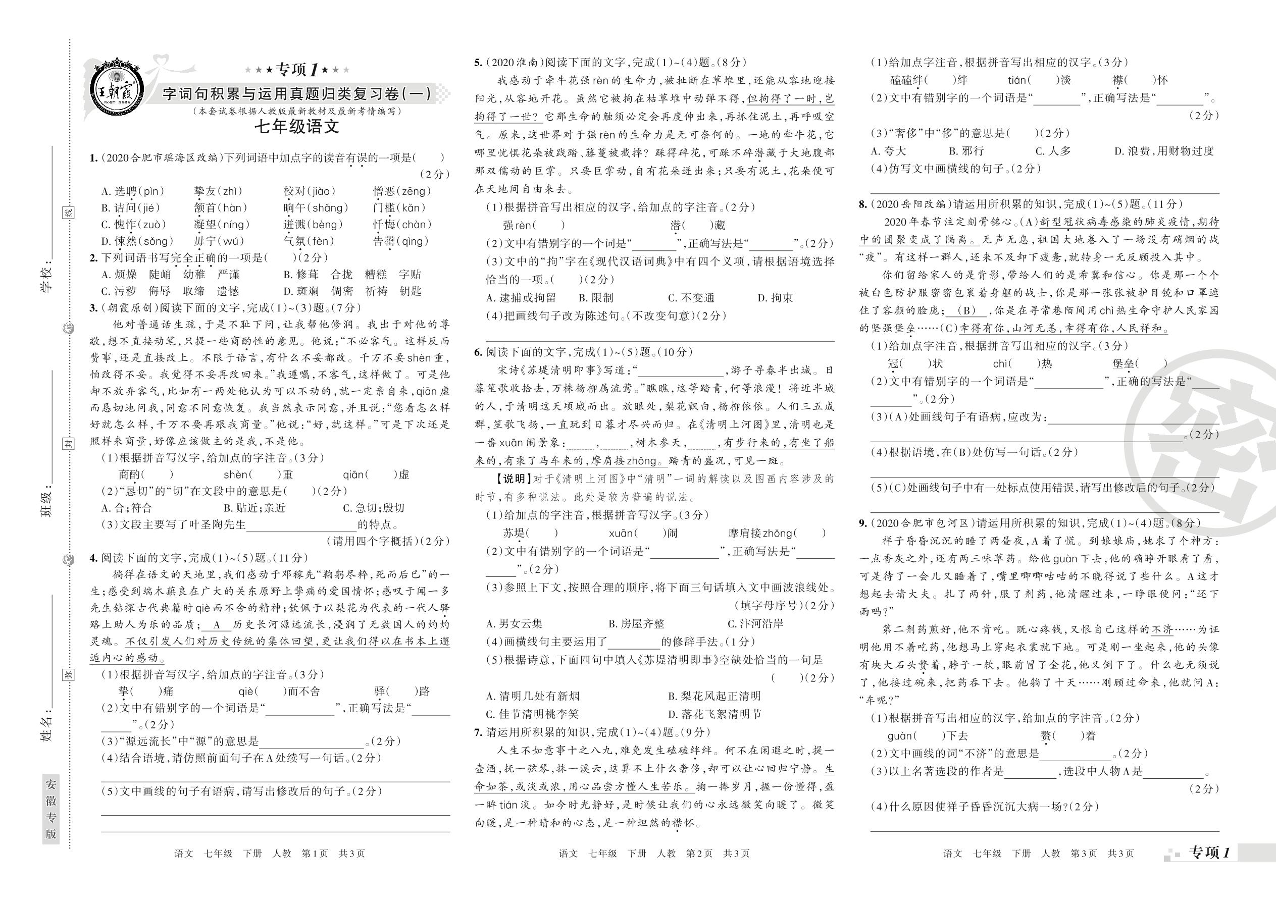 王朝霞期末专项卷——字词句积累与运用一、字词句积累与运用二真题归类复习七年级下册语文(人教版)【0】
