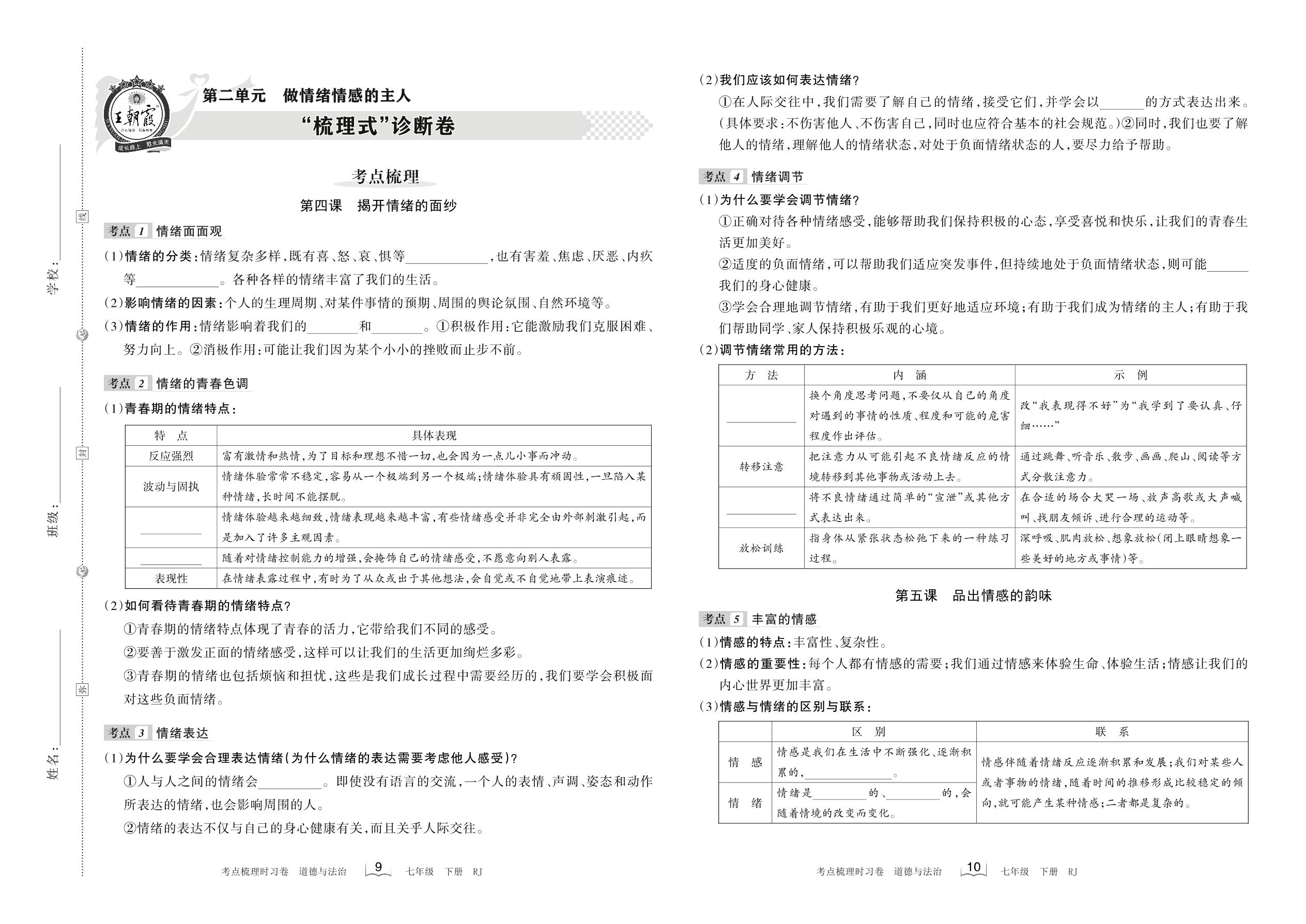 2022下册七年级道德与法治人教版 第二单元 “梳理式”诊断卷