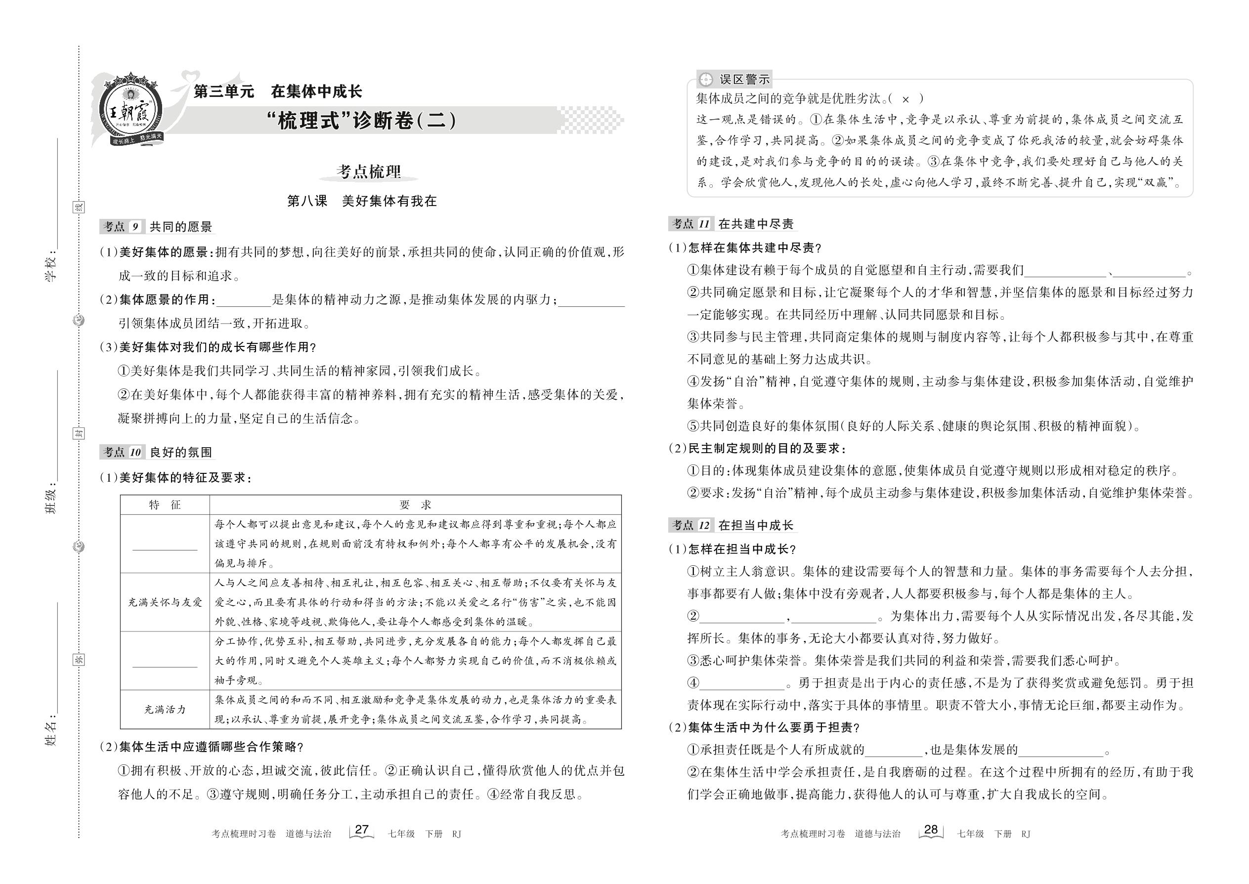 2022下册七年级道德与法治人教版 第三单元 “梳理式”诊断卷(二)