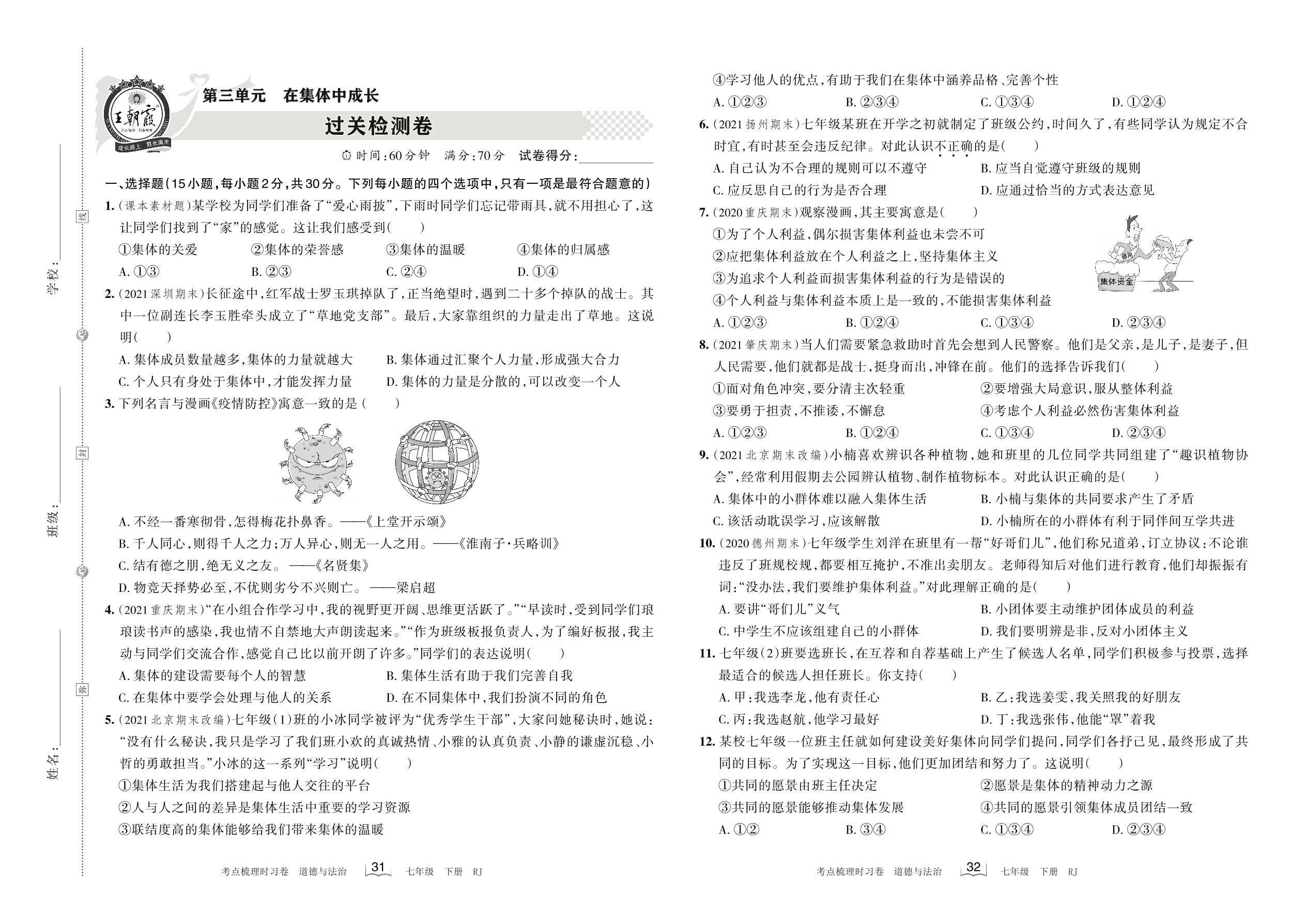 2022下册七年级道德与法治人教版 第三单元 过关检测卷