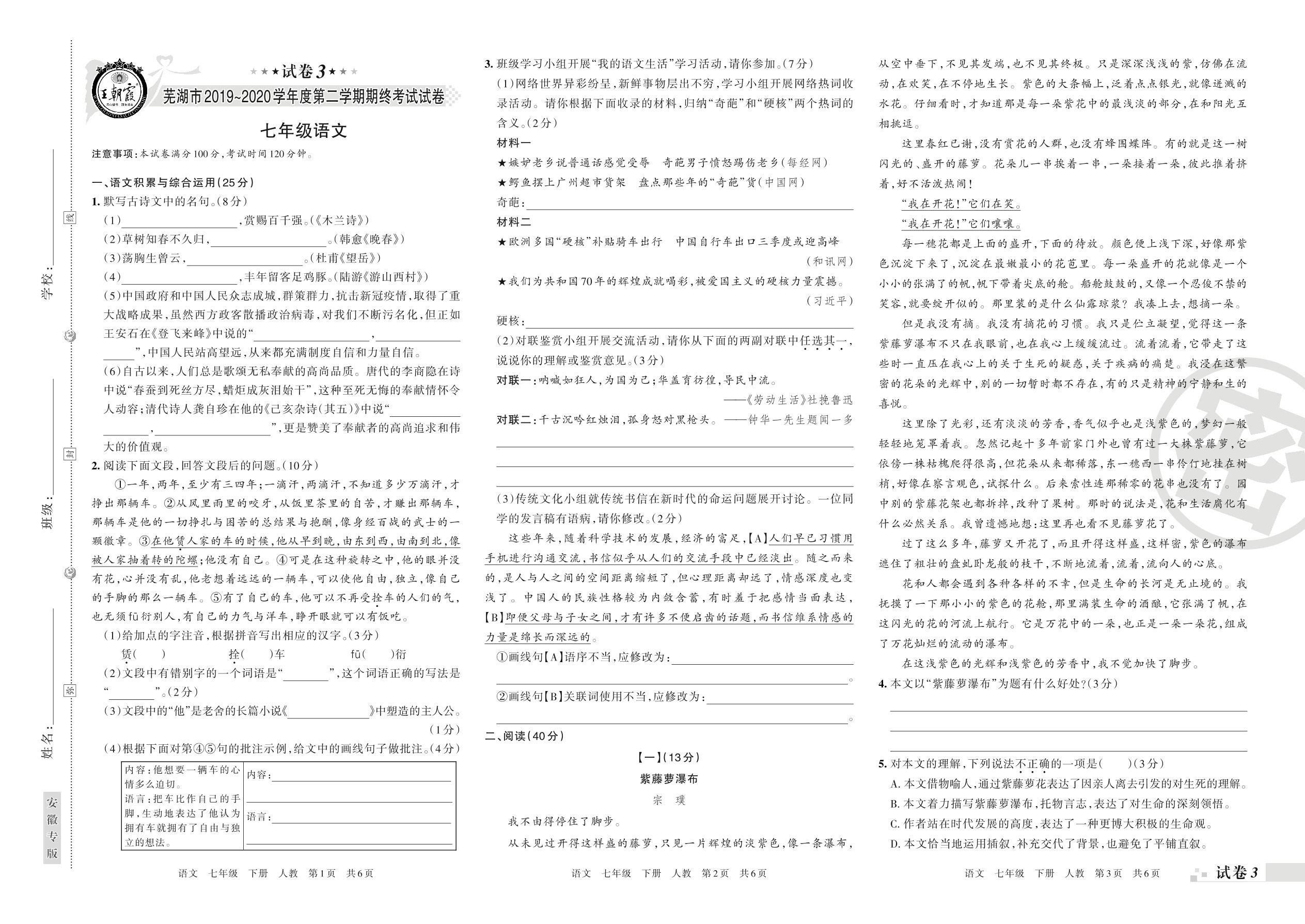 2019-2020学年第二学期芜湖市七年级语文试卷(人教版)【3】