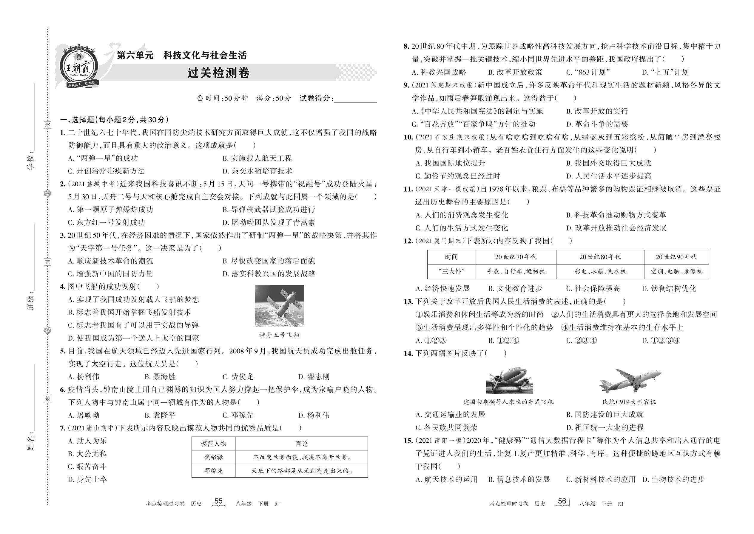 2022下册八年级历史人教版 第六单元 过关检测卷