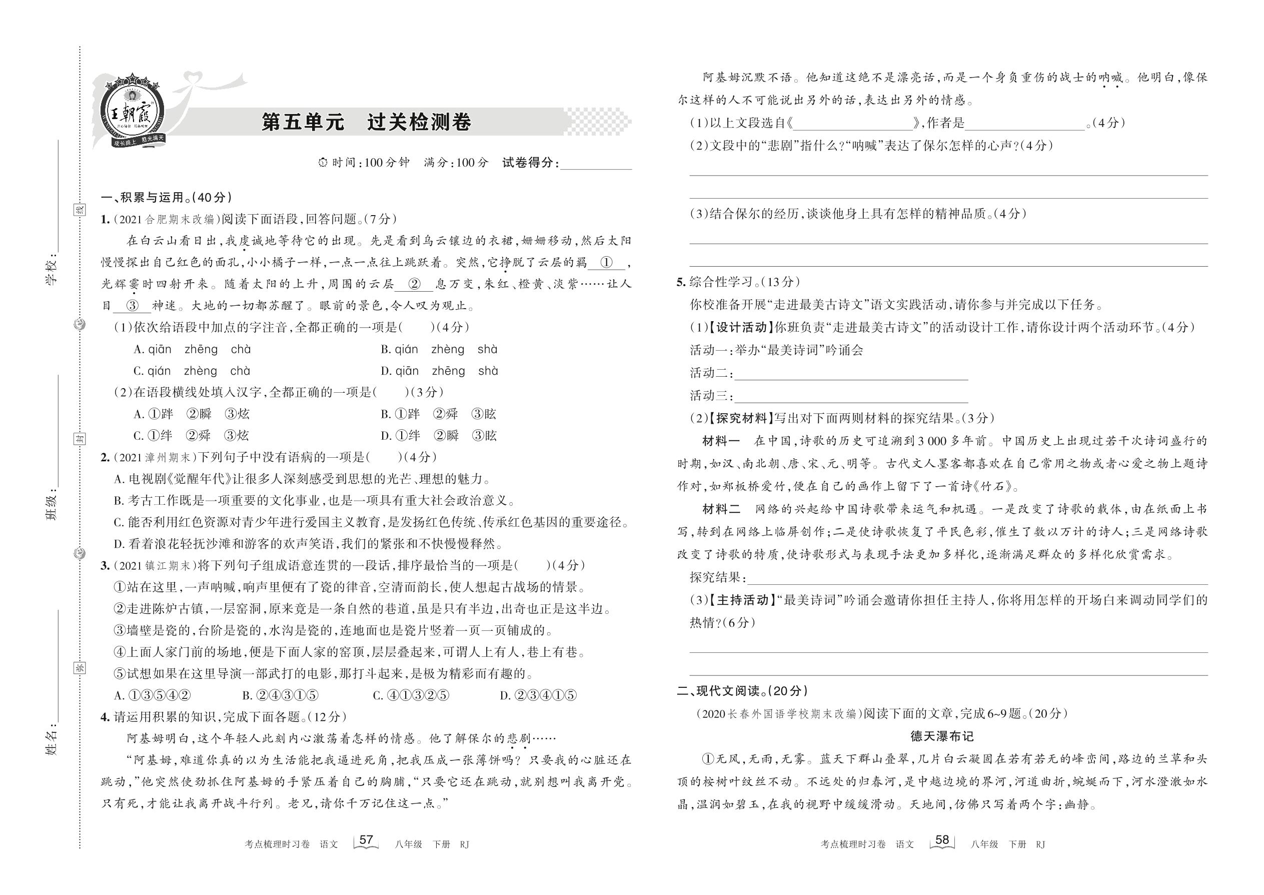 2022下册八年级语文人教版 第五单元 过关检测卷