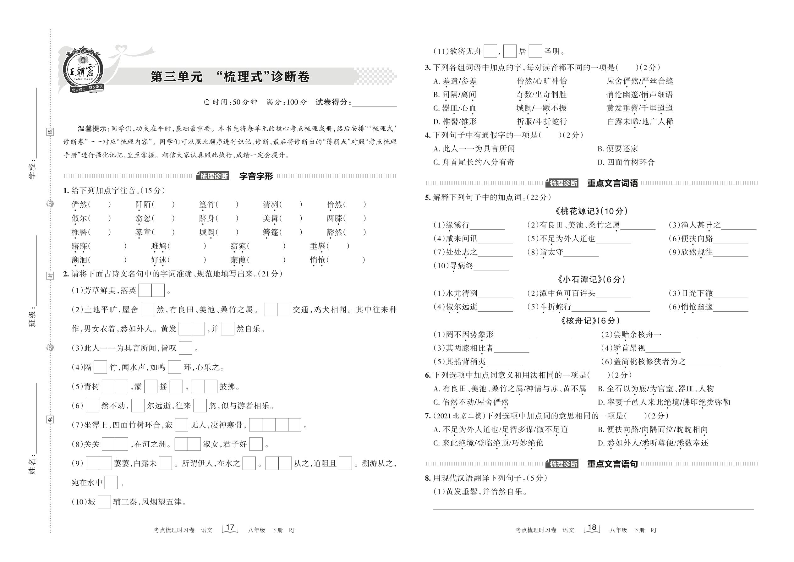 2022下册八年级语文人教版 第三单元 “梳理式”诊断卷