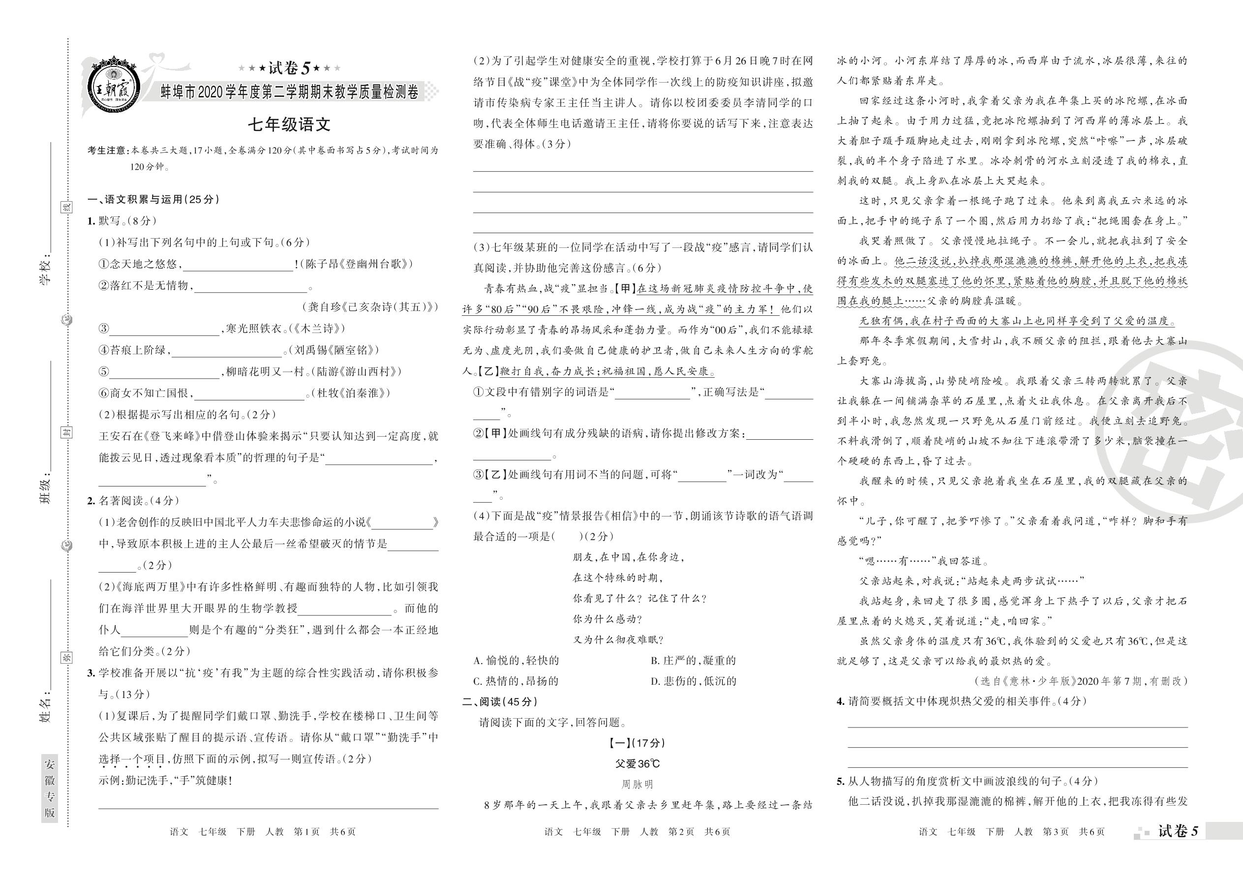 2019-2020学年第二学期蚌埠市七年级语文试卷(人教版)【5】