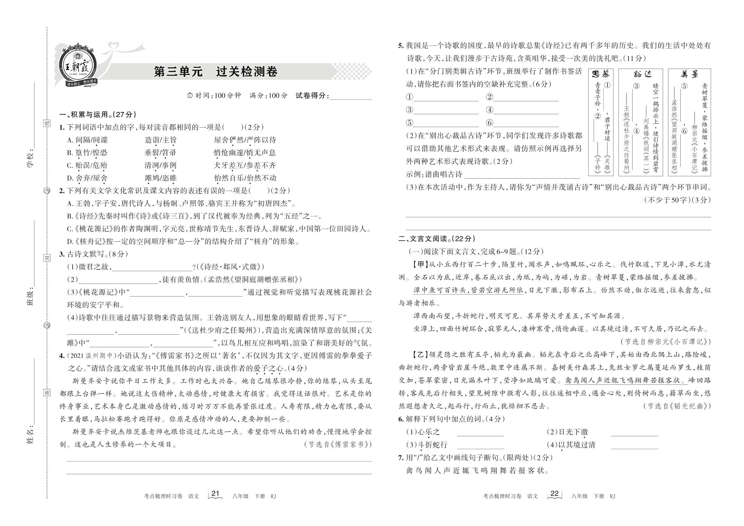 2022下册八年级语文人教版 第三单元 过关检测卷