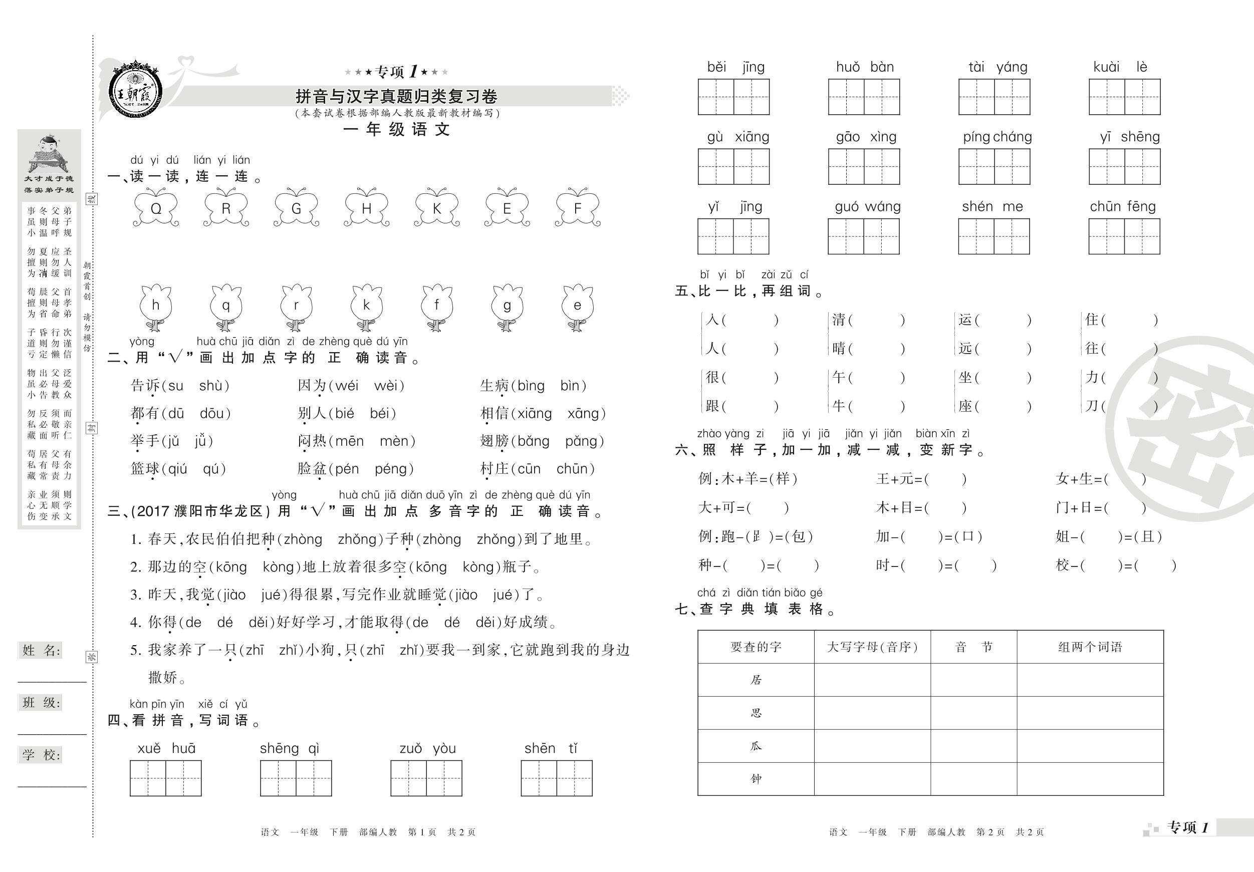 王朝霞期末专项卷——拼音与汉字、词语与句子真题归类复习一年级下册语文(人教版)_R210731182850【0】