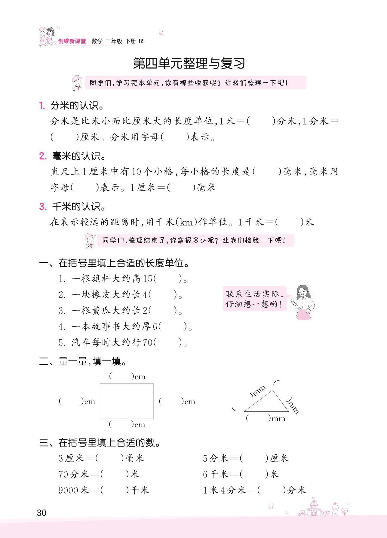 2022下册二年级数学北师版 四 测量——第四单元整理与复习