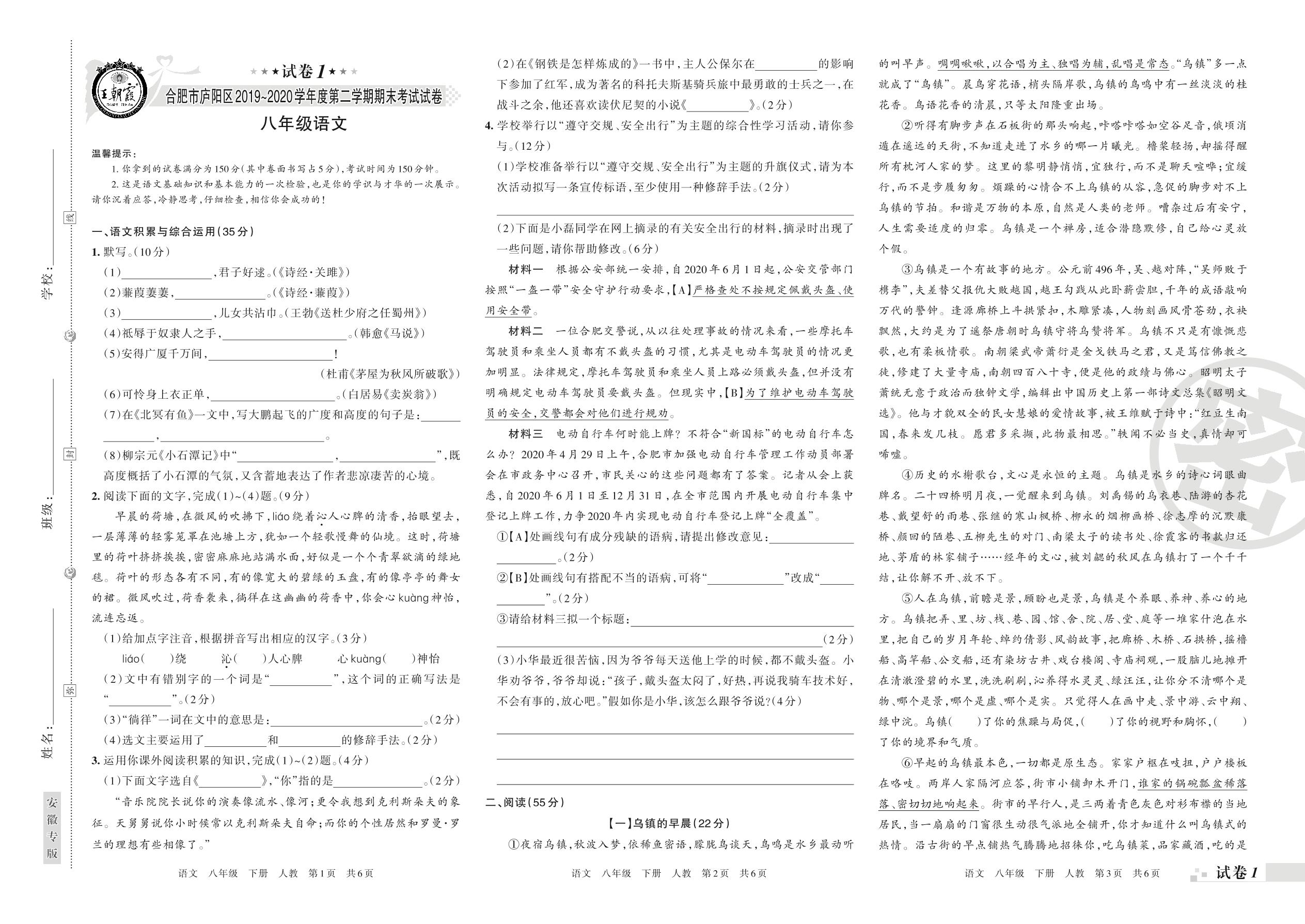 2019-2020学年第二学期合肥市庐阳区八年级语文试卷(人教版)【1】