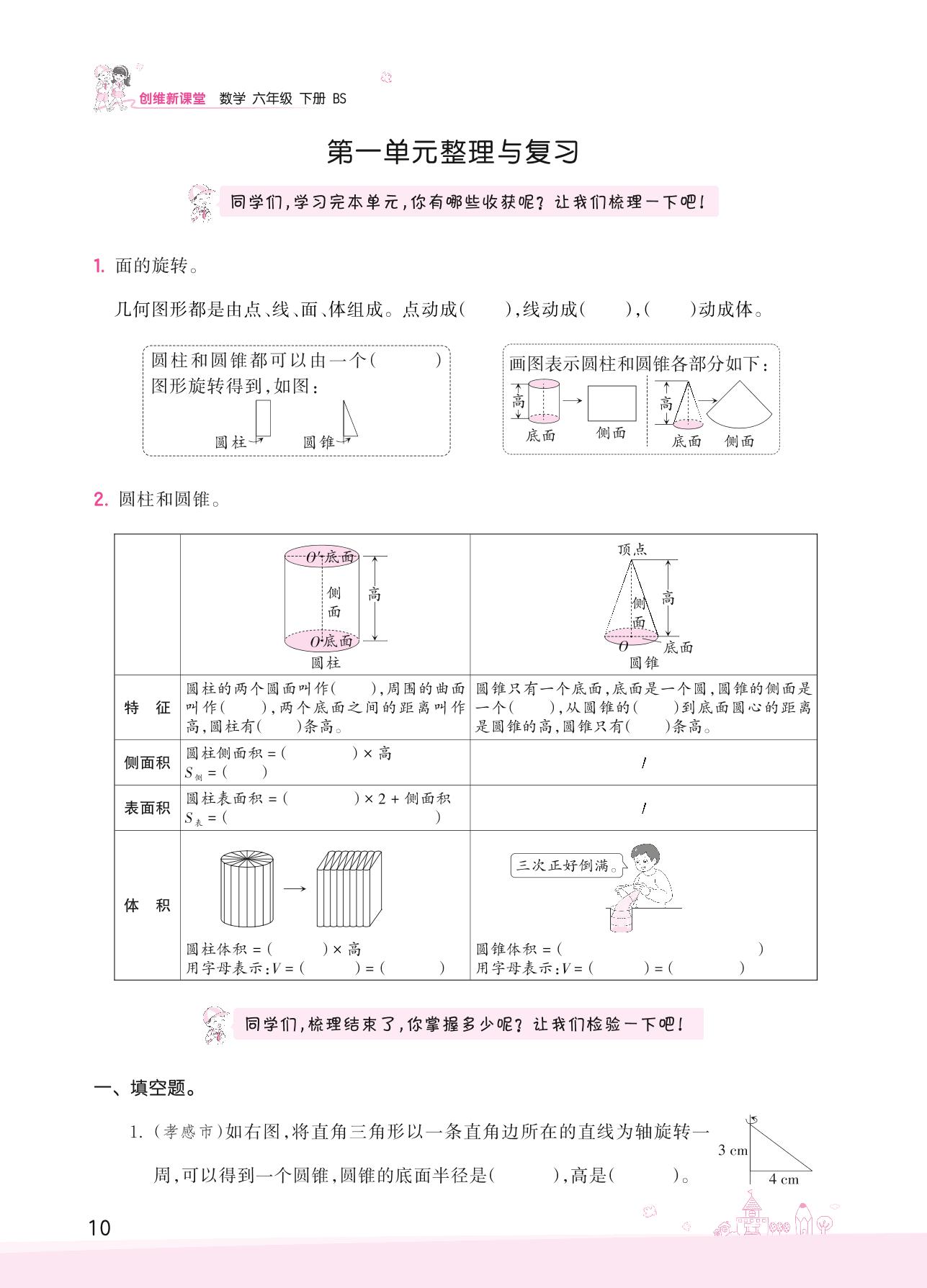 2022下册六年级数学北师版 一 圆柱与圆锥——第一单元整理与复习