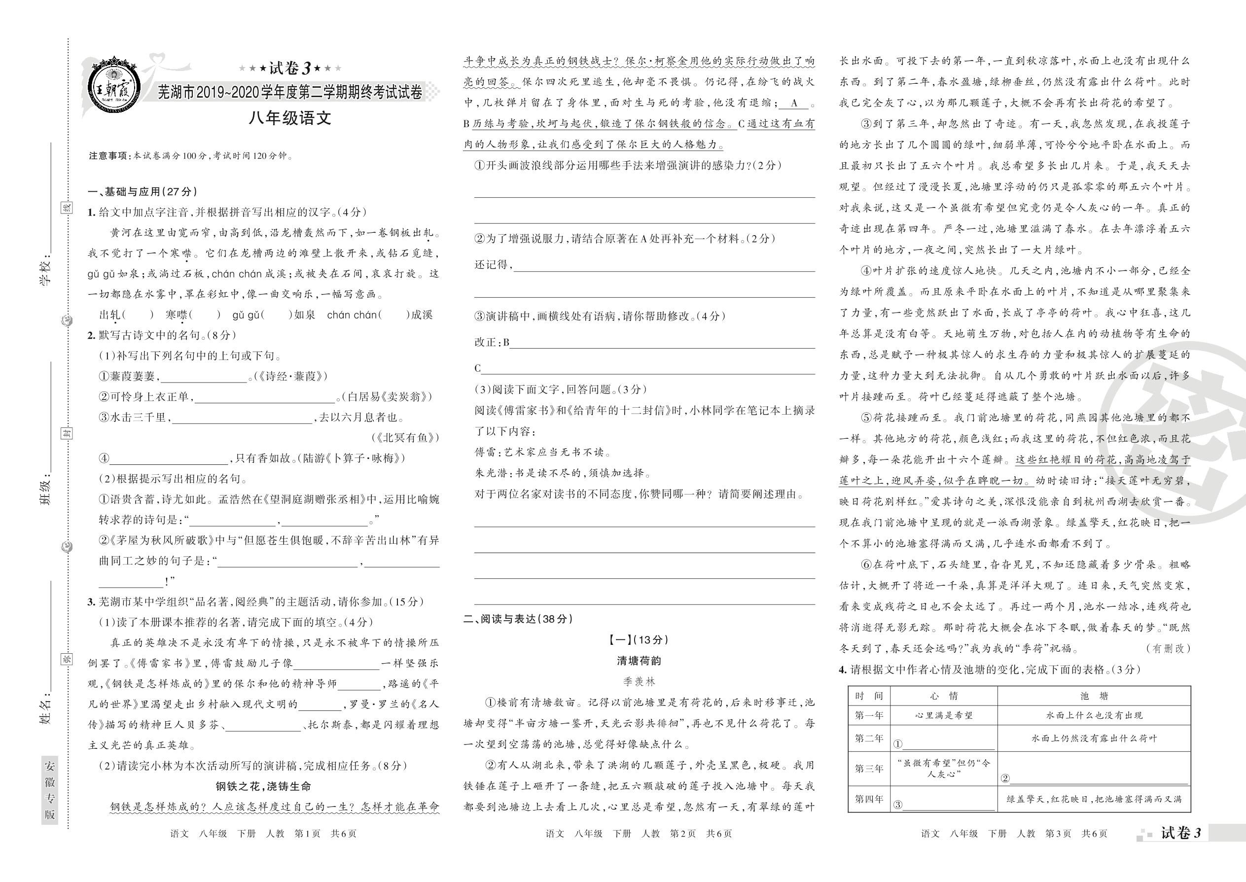 2019-2020学年第二学期芜湖市八年级语文试卷(人教版)【3】