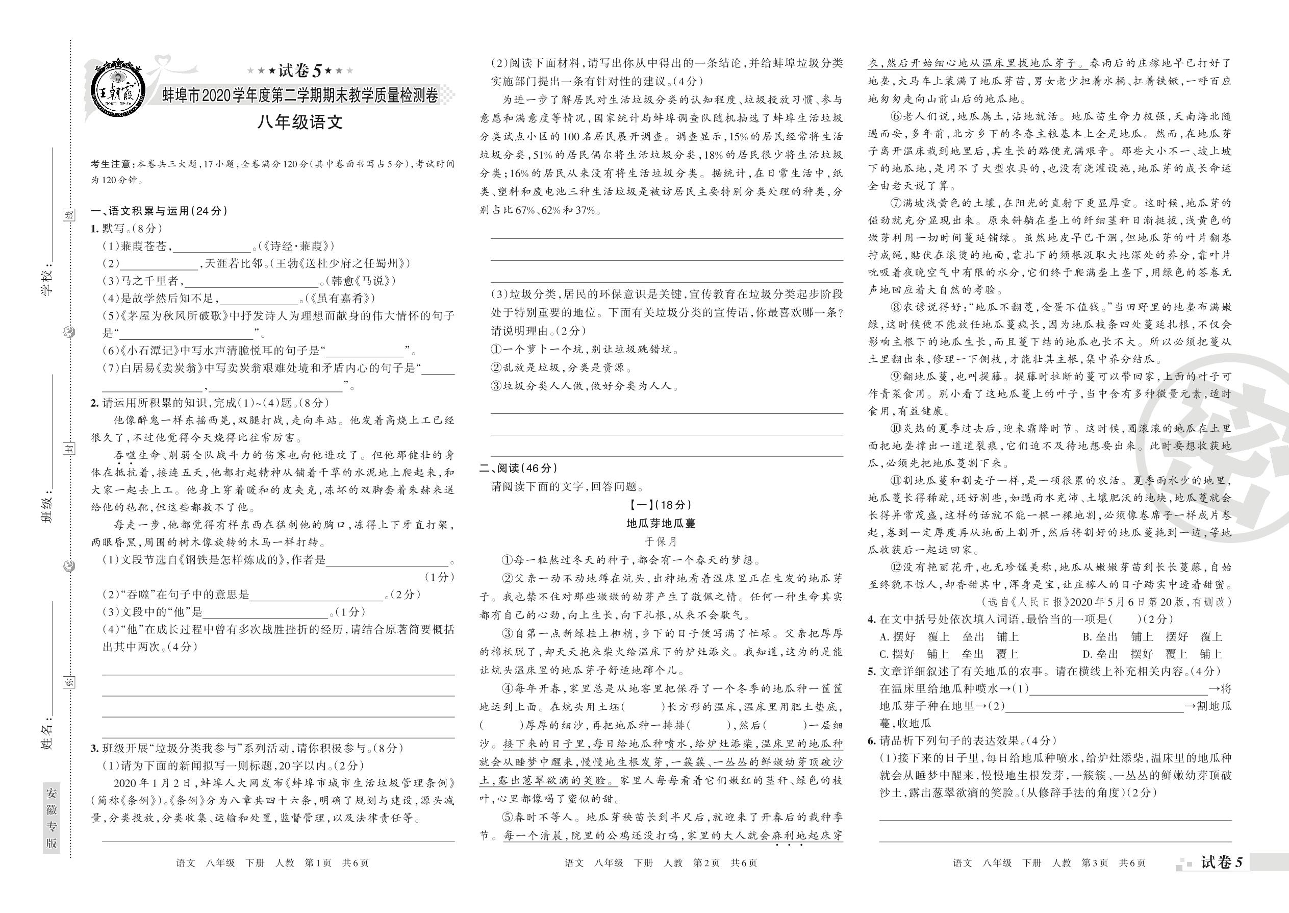 2019-2020学年第二学期蚌埠市八年级语文试卷(人教版)【5】