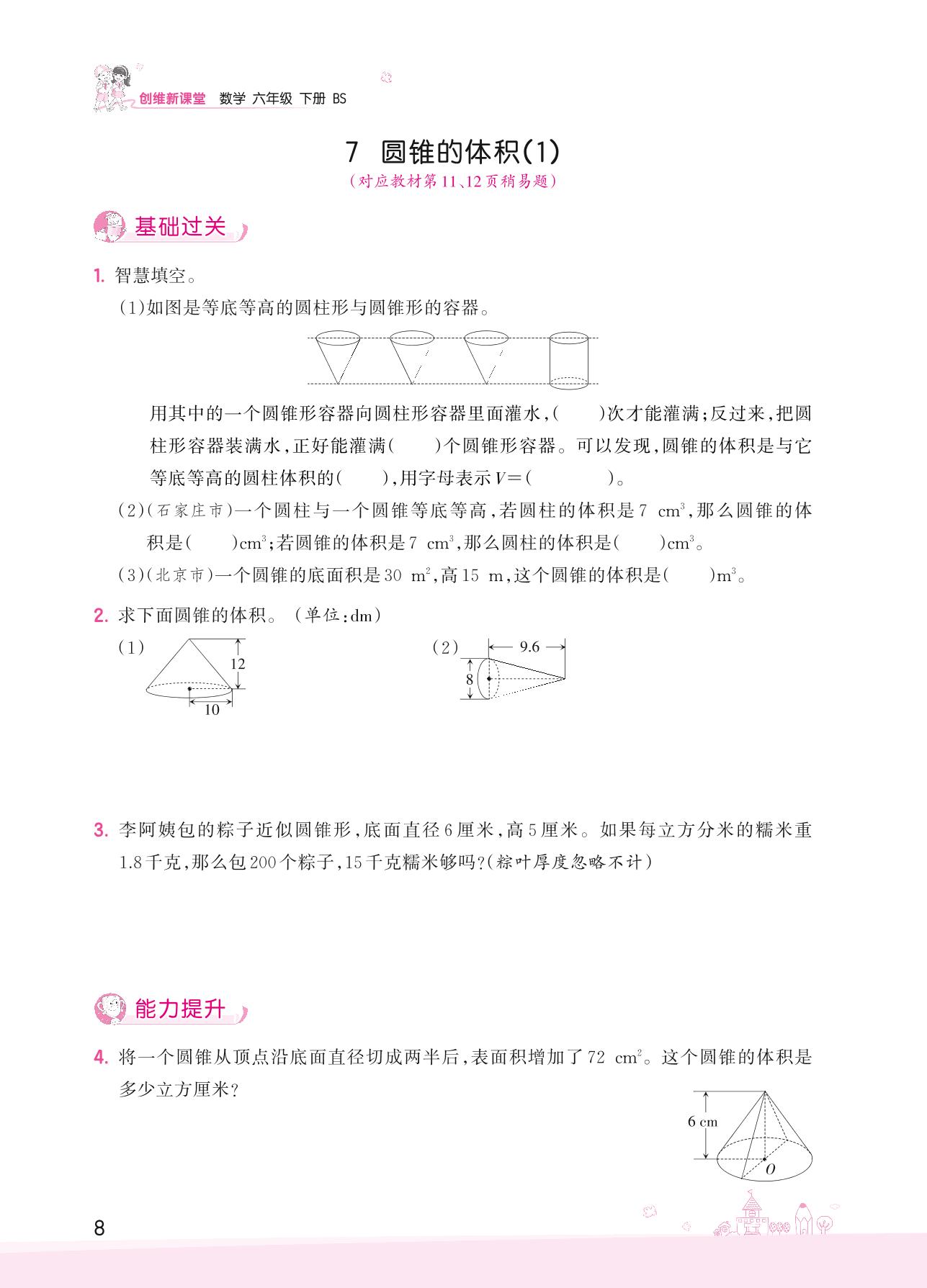 2022下册六年级数学北师版 一 圆柱与圆锥——7 圆锥的体积(1)