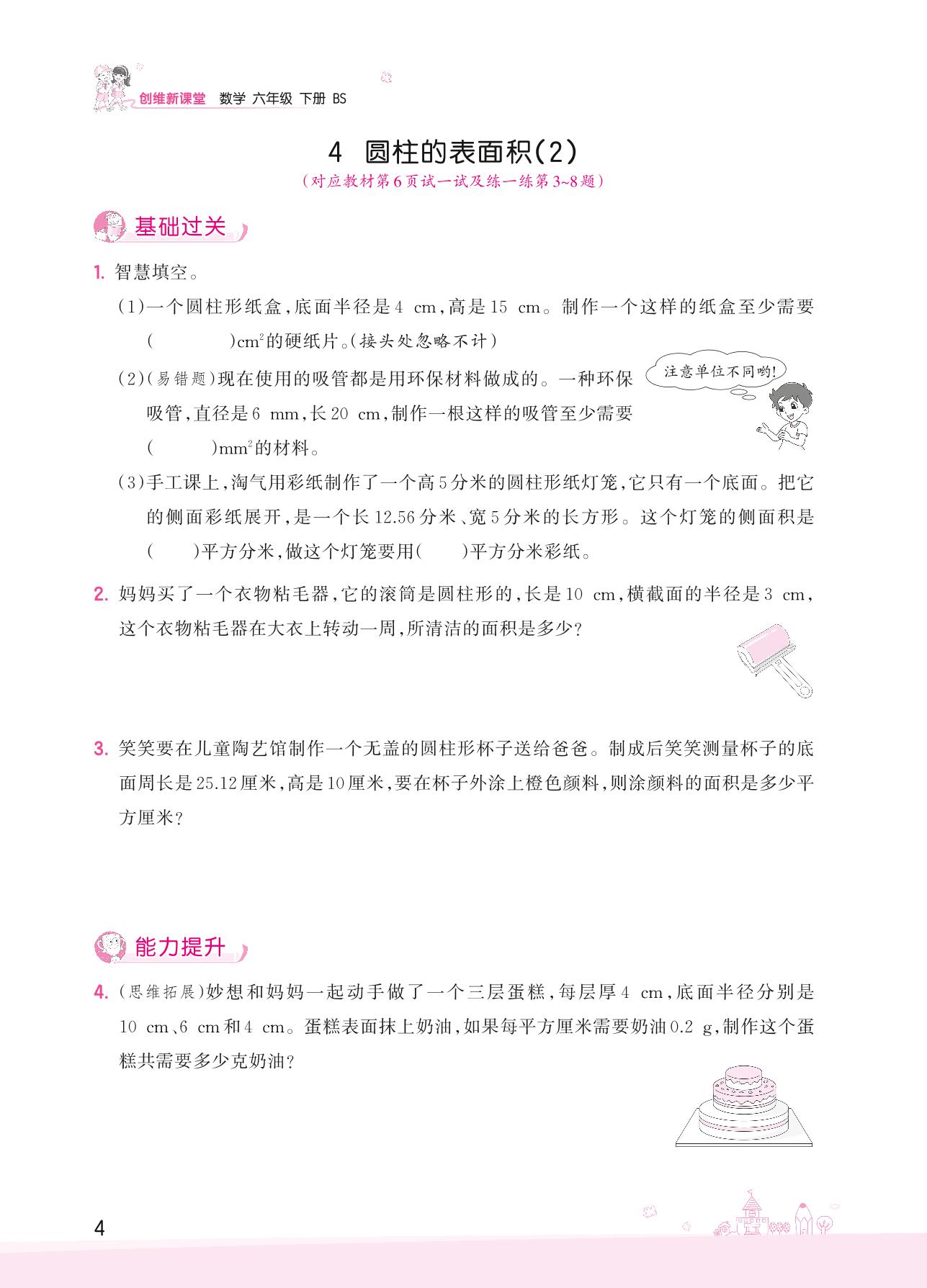 2022下册六年级数学北师版 一 圆柱与圆锥——4 圆柱的表面积(2)