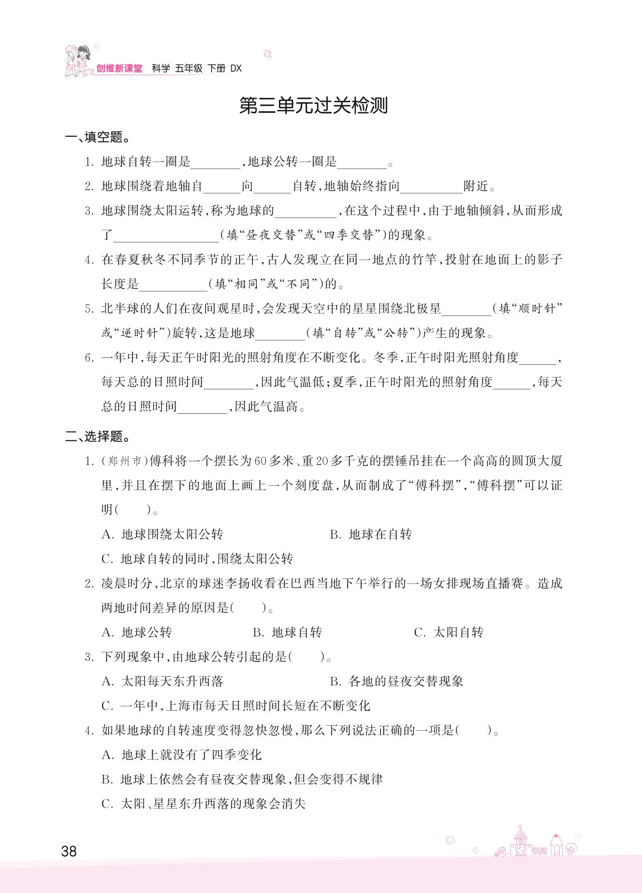 2022下册五年级科学大象版 第三单元 转动的地球——第三单元过关检测