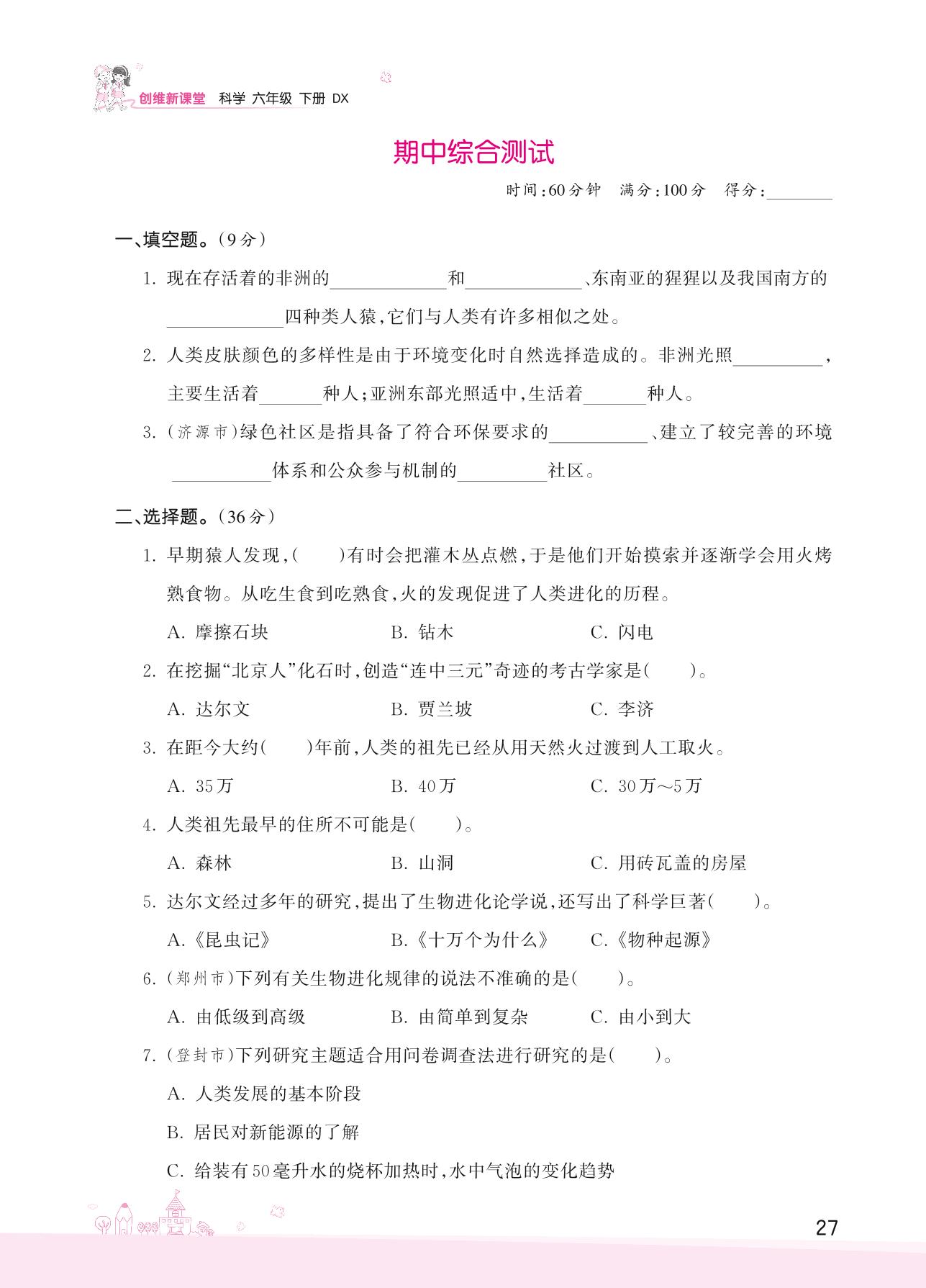 2022下册六年级科学大象版 期中综合测试