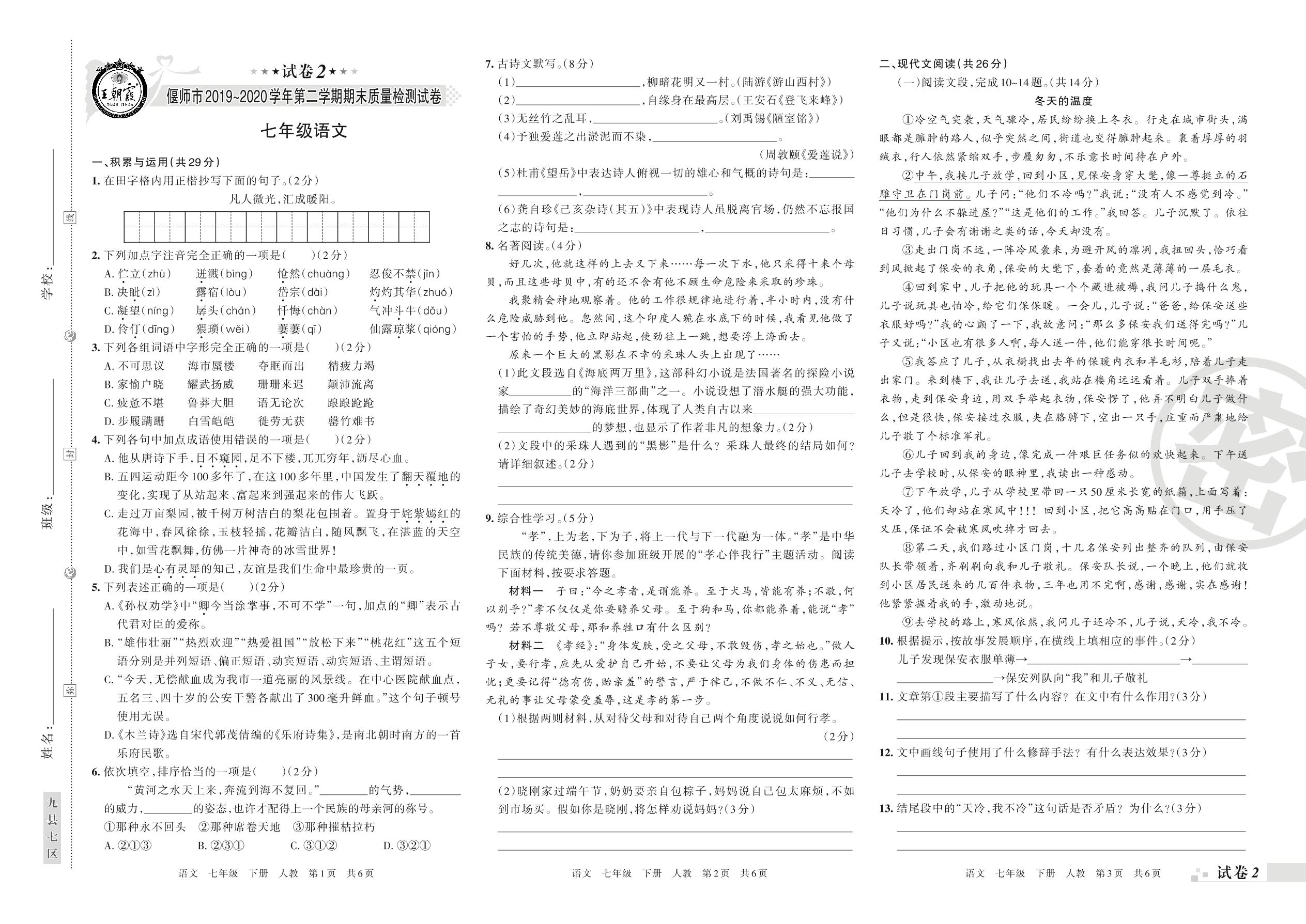 2019-2020学年第二学期偃师市七年级语文试卷(人教版)【2】