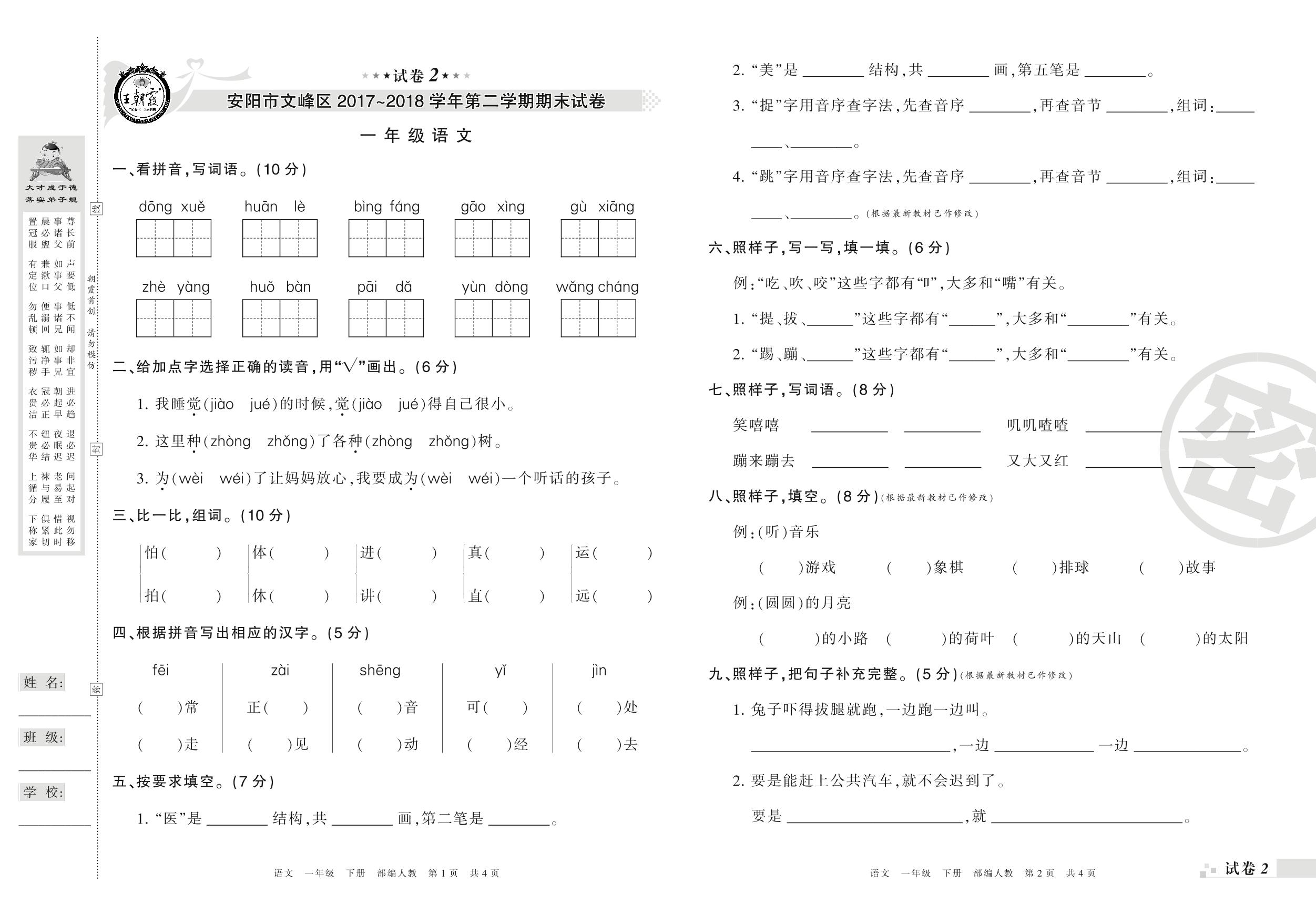 2017-2018学年第二学期安阳市文峰区一年级语文试卷(人教版)【2】
