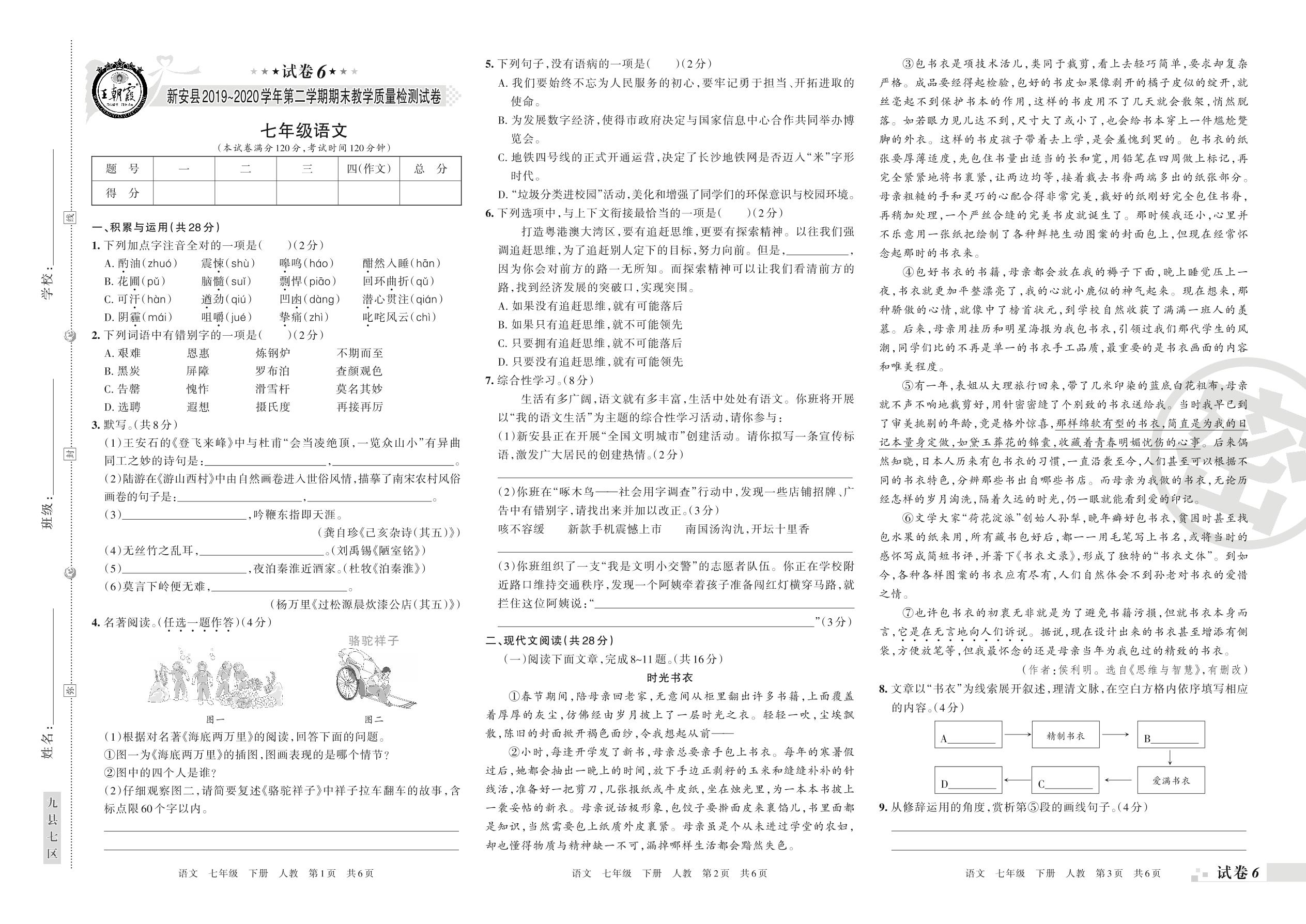 2019-2020学年第二学期洛阳市新安县七年级语文试卷(人教版)【6】