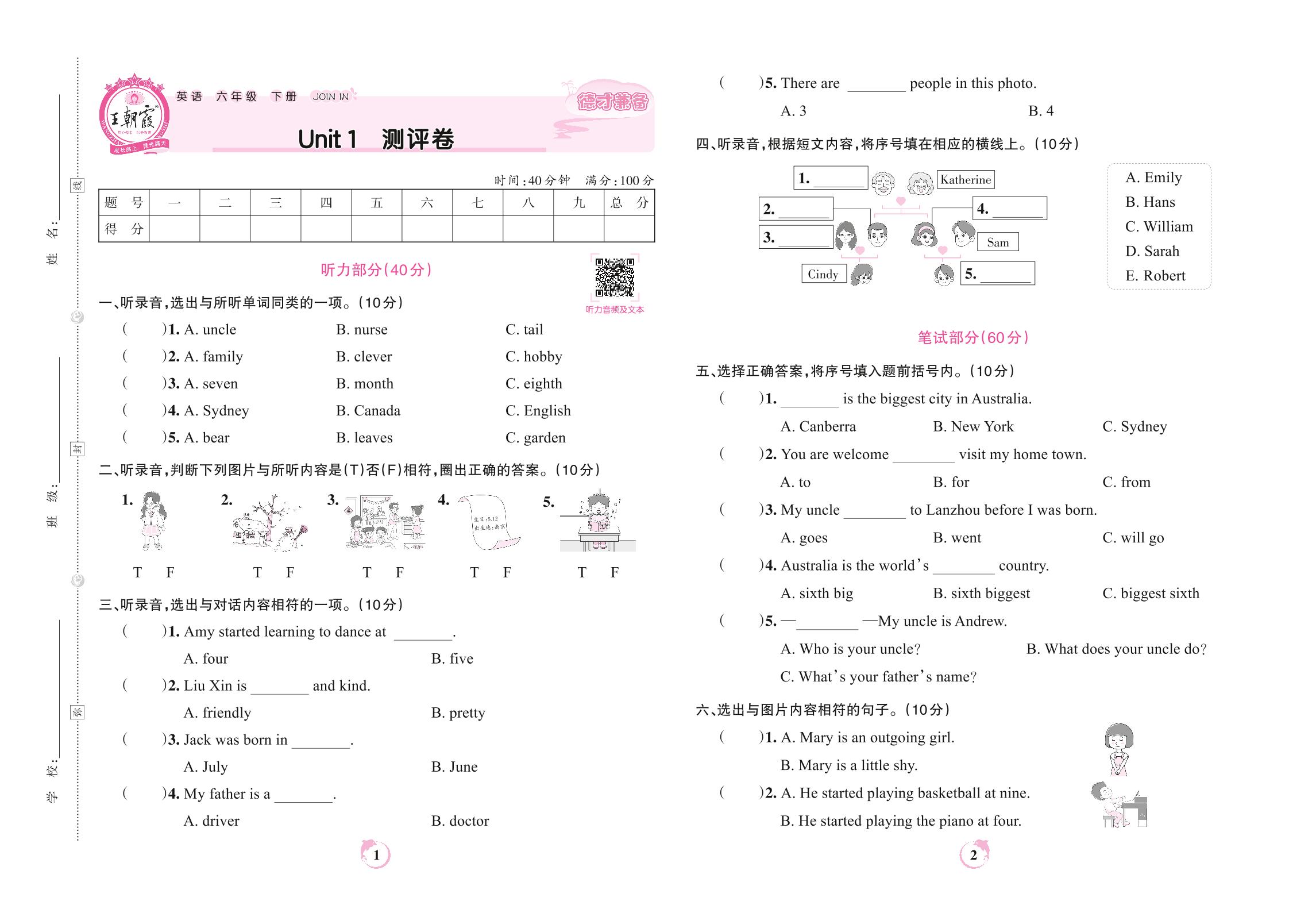 2022下册六年级英语剑桥版 Unit 1 测评卷