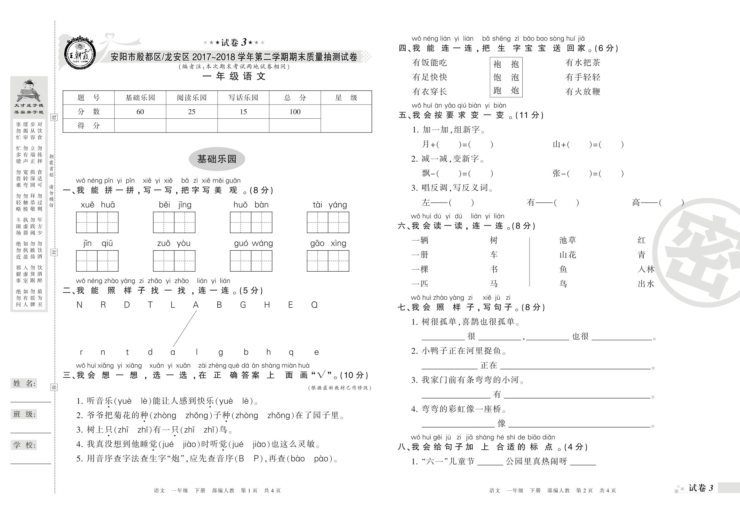 2017-2018学年第二学期安阳市殷都区(龙安区)一年级语文试卷(人教版)【3】