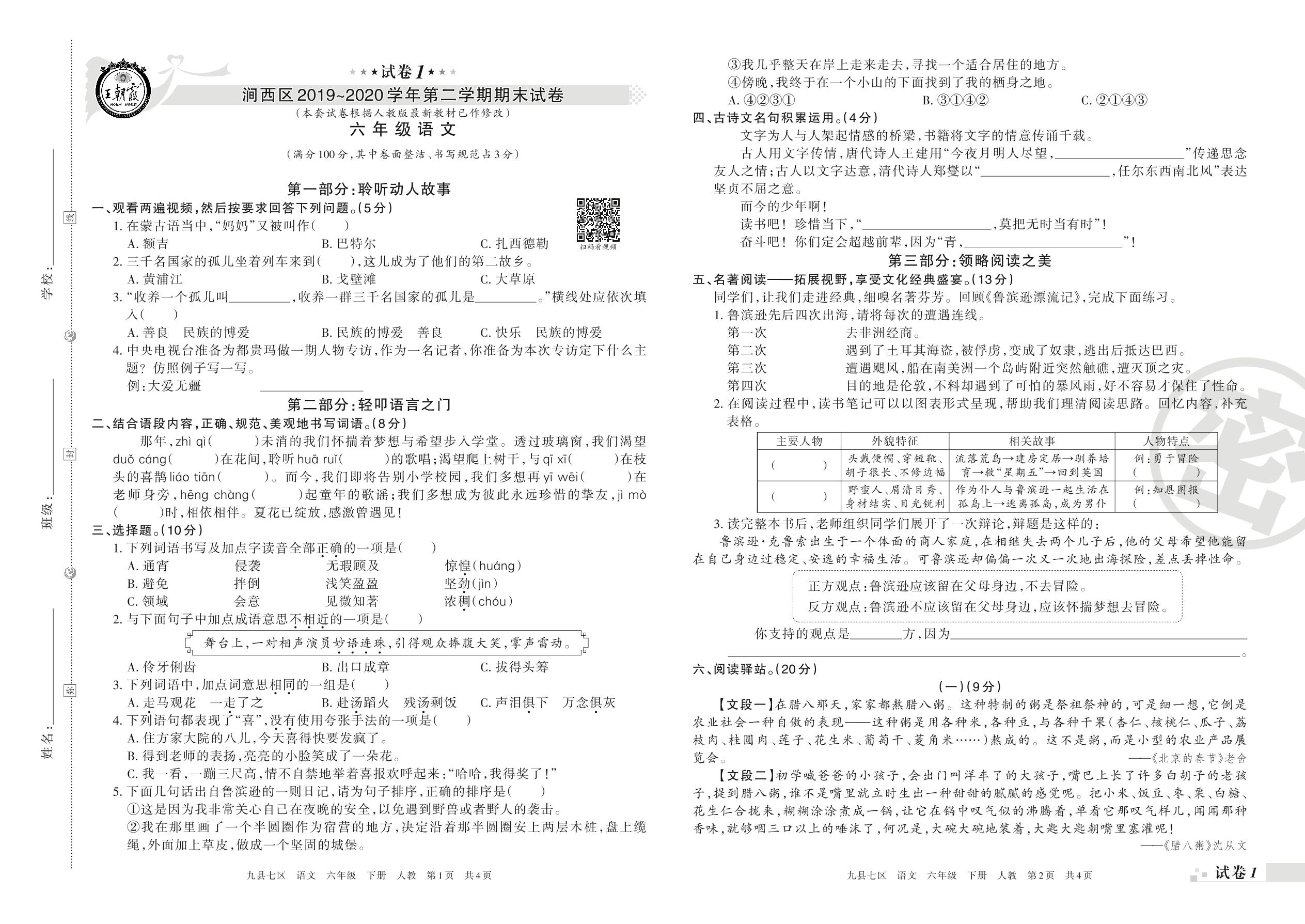 2019-2020学年第二学期洛阳市涧西区六年级语文试卷(人教版)【1】