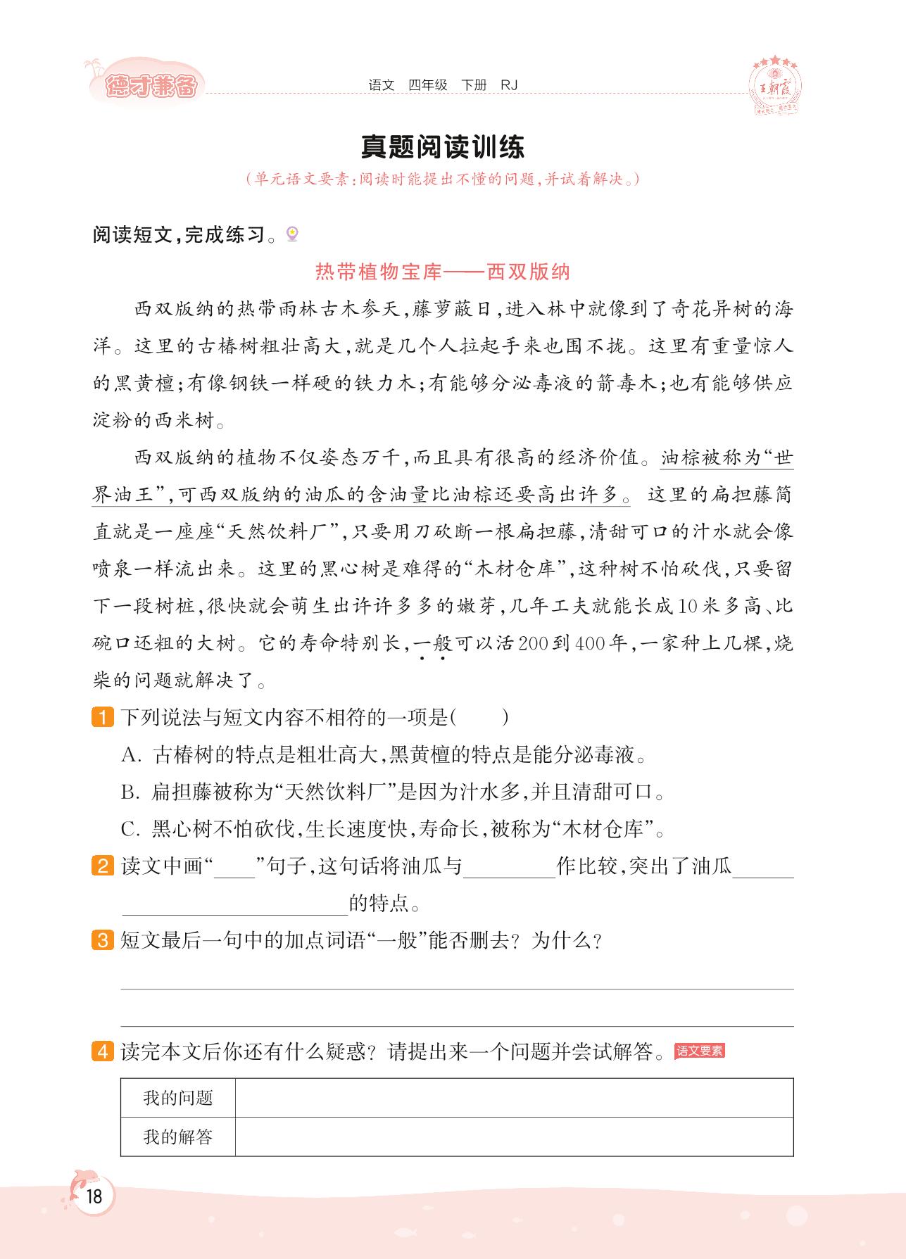 2022下册四年级语文人教版 第二单元 自然、科技——真题阅读训练