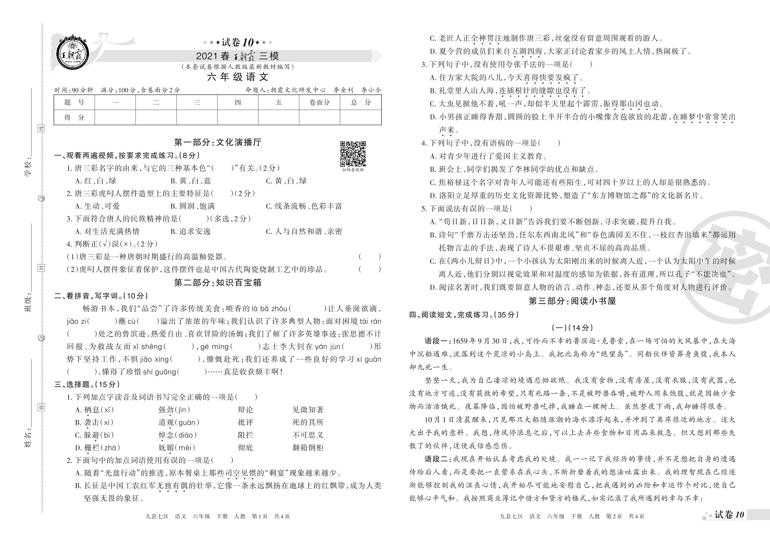 王朝霞期末模拟卷六年级下册语文(人教版)_R210801235853【10】
