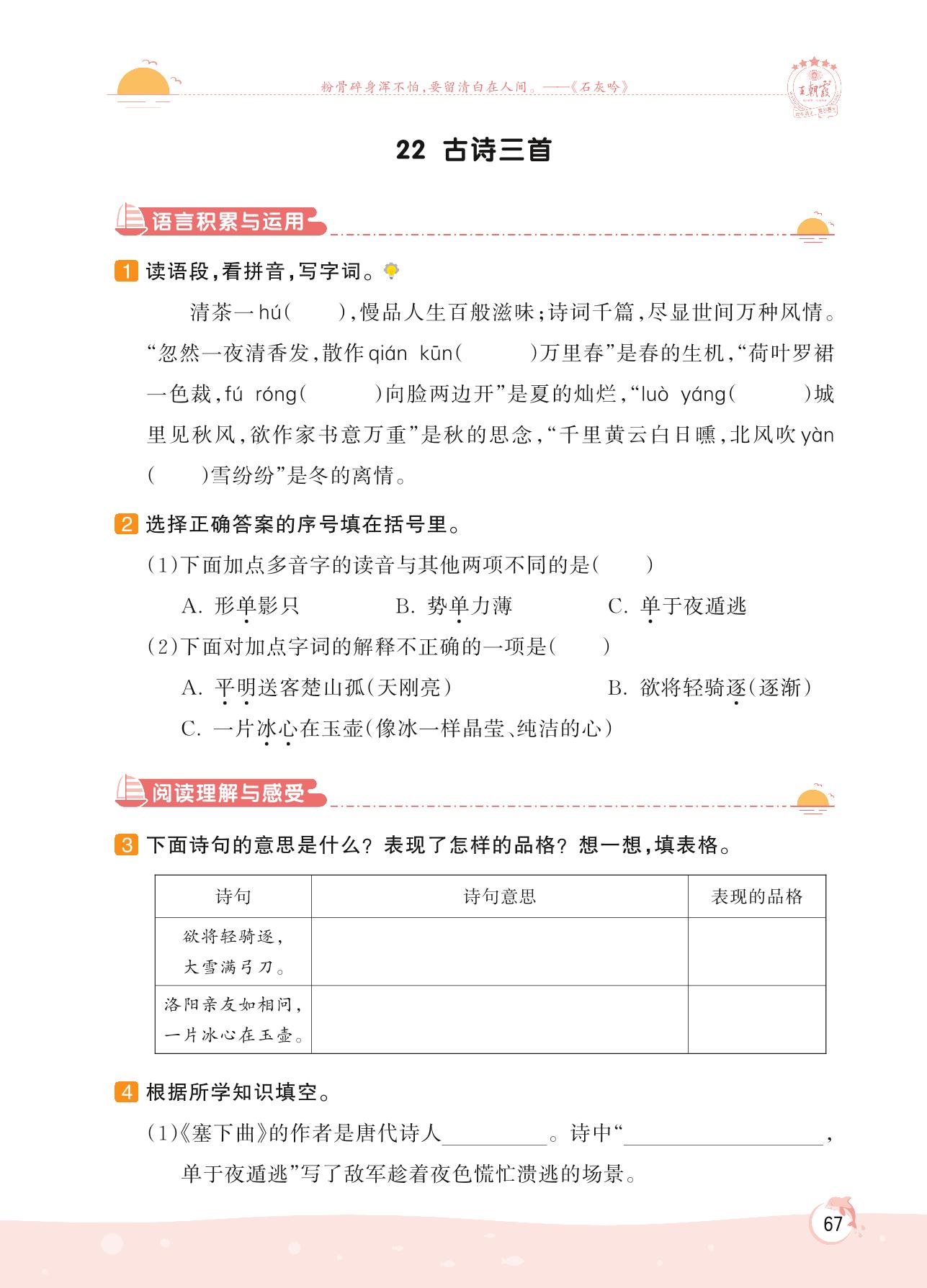 2022下册四年级语文人教版 第七单元 人物品质——22 古诗三首