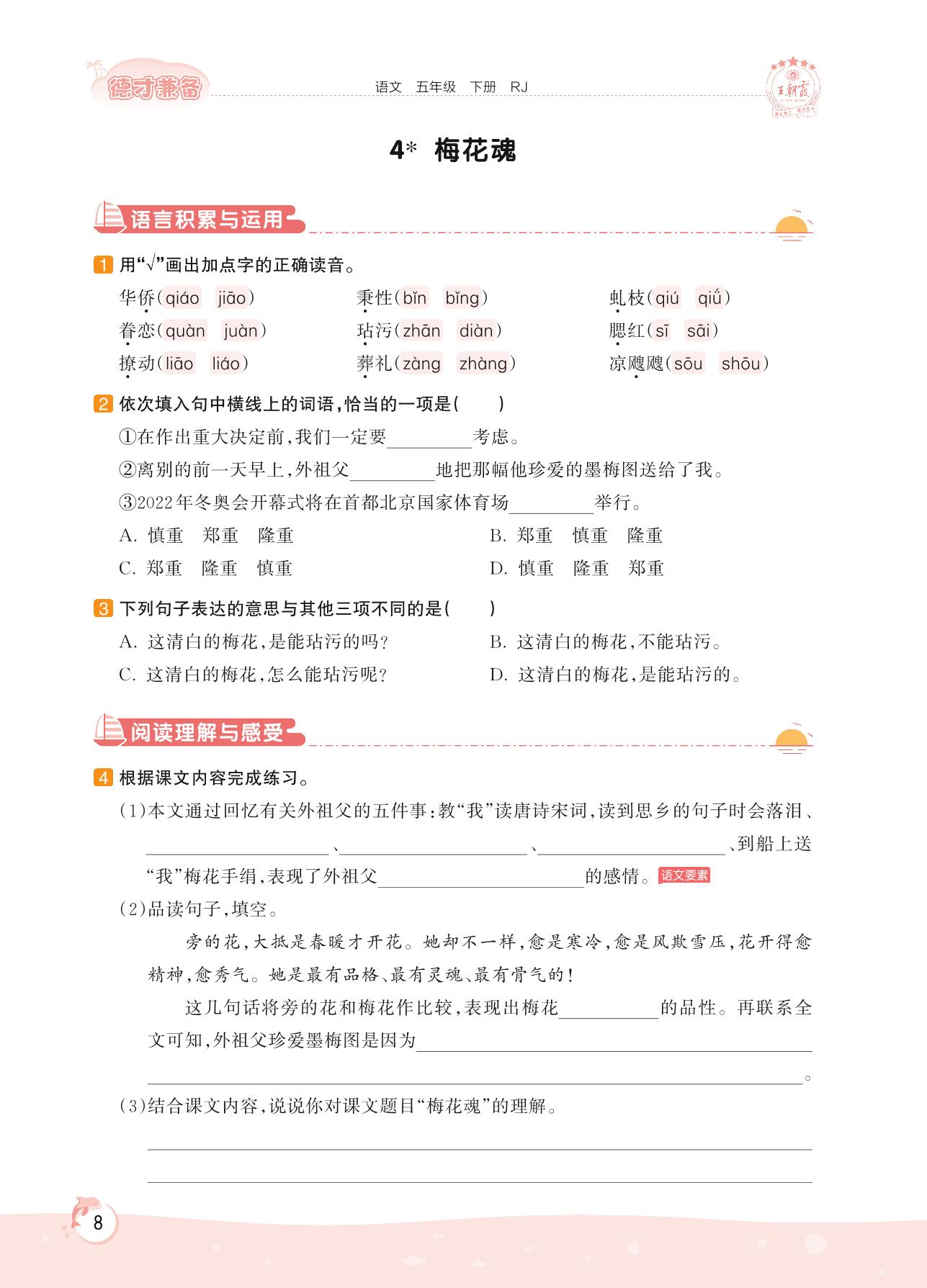 2022下册五年级语文人教版 第一单元 童年往事——4 梅花魂