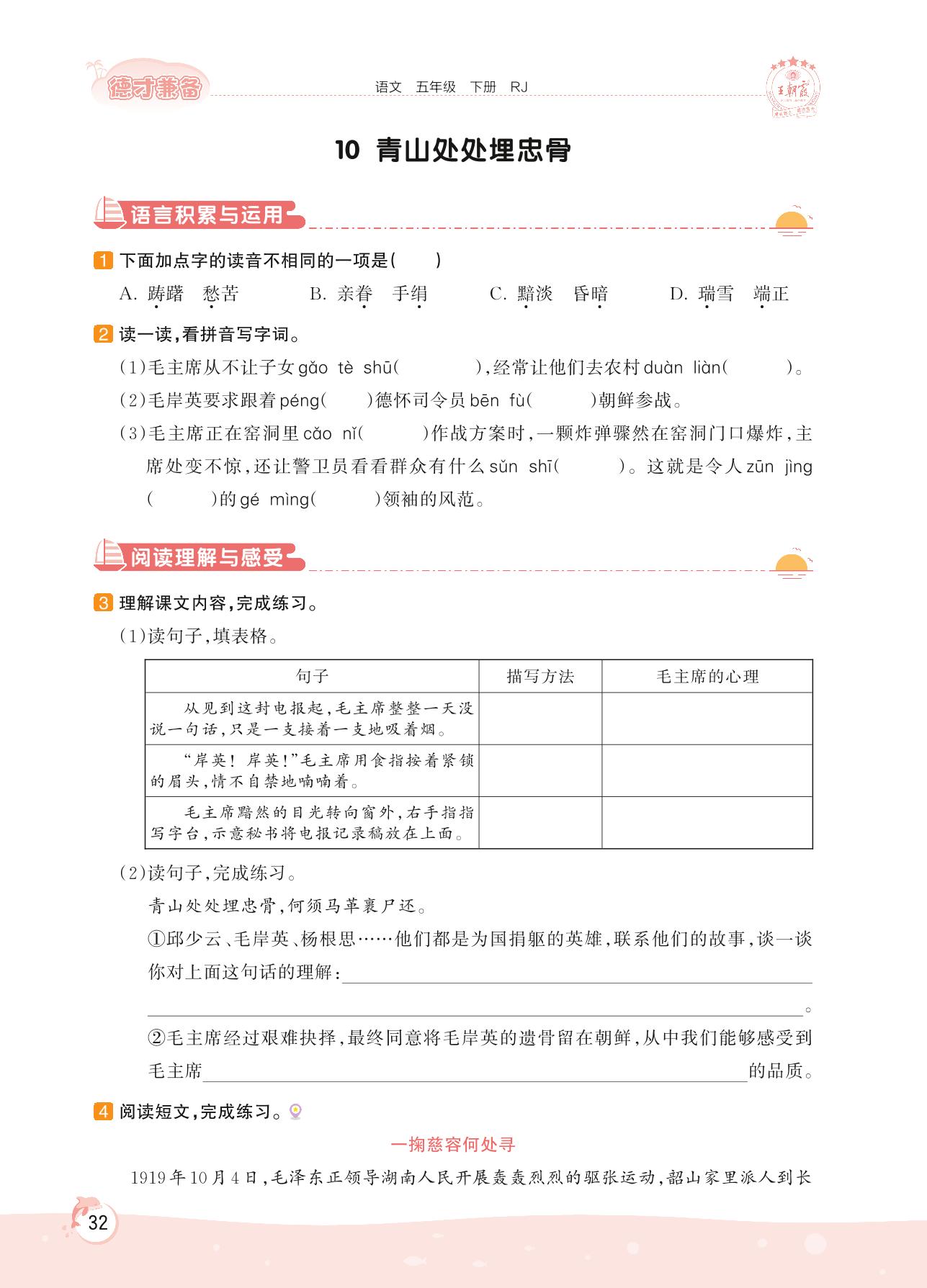 2022下册五年级语文人教版 第四单元 责任——10 青山处处埋忠骨