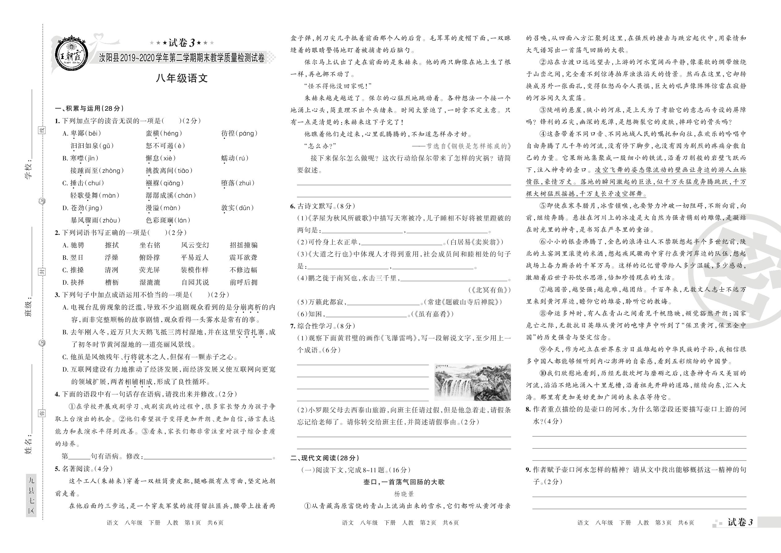 2019-2020学年第二学期洛阳市汝阳县八年级语文试卷(人教版)【3】