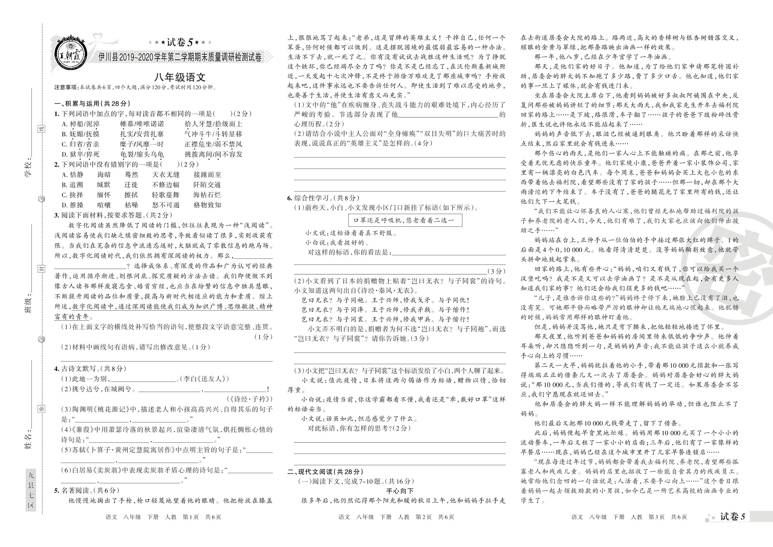 2019-2020学年第二学期洛阳市伊川县八年级语文试卷(人教版)【5】