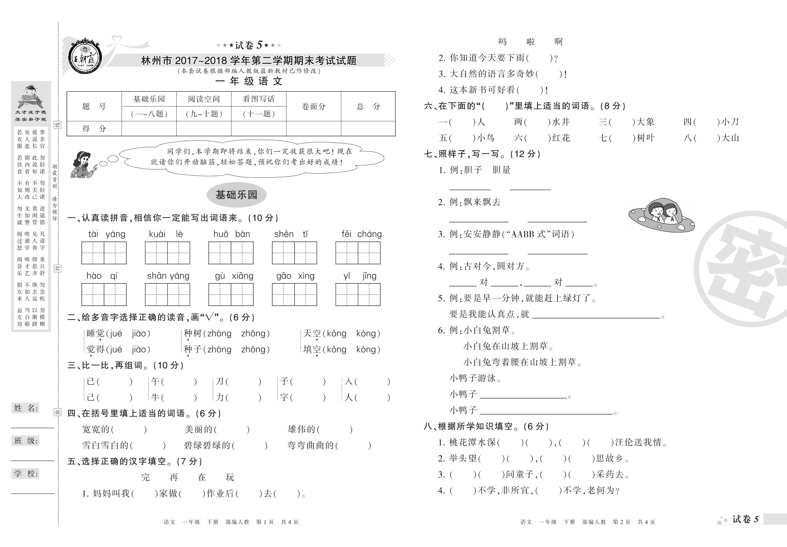 2017-2018学年第二学期林州市一年级语文试卷(人教版)【5】