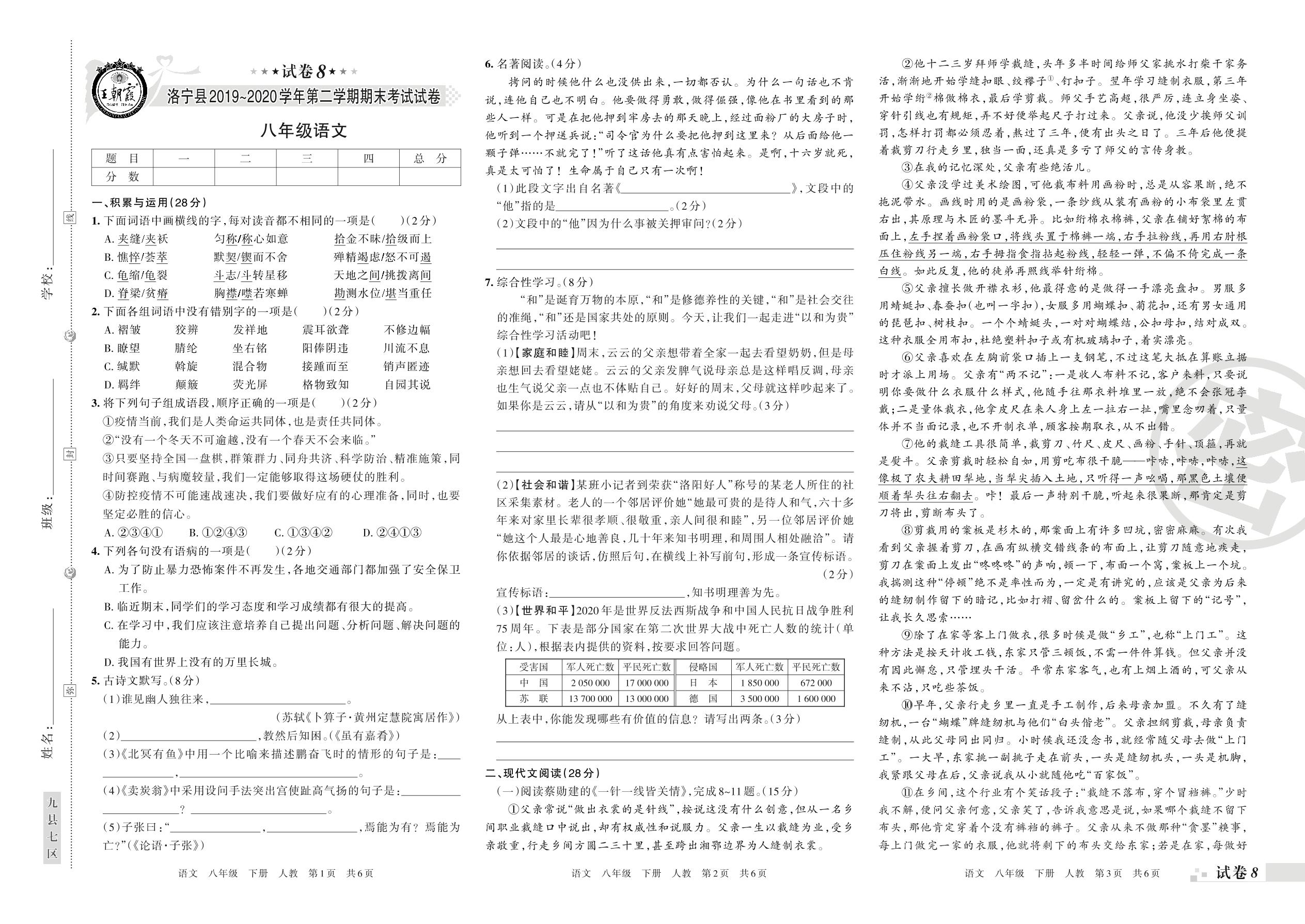 2019-2020学年第二学期洛阳市洛宁县八年级语文试卷(人教版)【8】