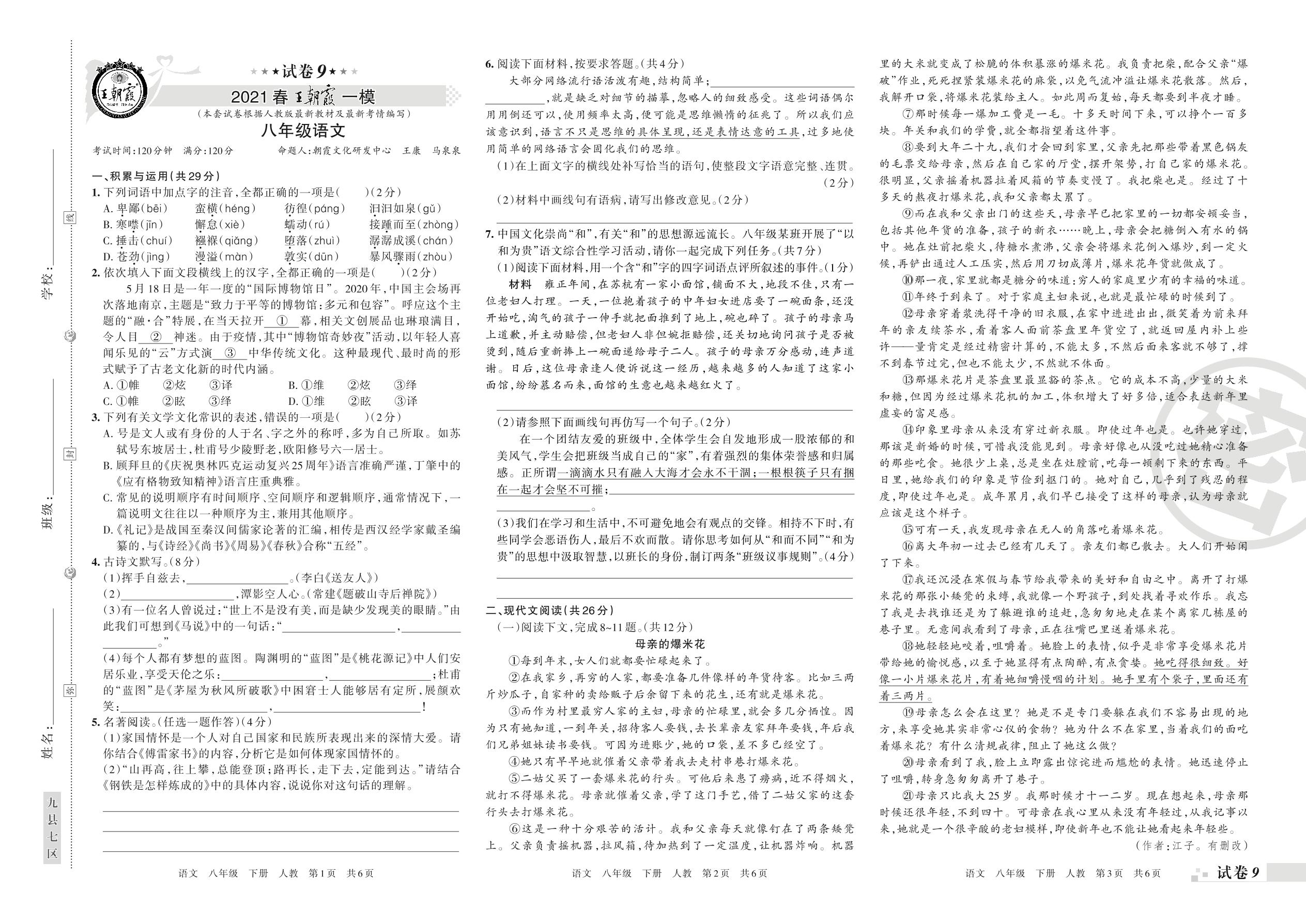 王朝霞期末模拟卷八年级下册语文(人教版)_R210802333【9】